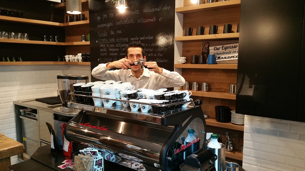 C’è poi la postazione per le estrazioni manuali: un vero banco da falegname che ospita sistemi a filtro come il V60, il chemex e l’aeropress, richiesti soprattutto a metà mattina e nel pomeriggio. L’espresso è venduto a 1,5 €, il cappuccino a 2 € e i metodi a filtro a 3 €. Non mancano brioches, torte, muffin, ma in quantità limitata: qui protagonista è il caffè, al quale è concessa l’unica aggiunta del latte, per realizzare cappuccini in latte art o con una schiuma più densa, ma sempre con un decoro. Chi vuole il classico marocchino deve rivolgersi a un altro locale. Come pure chi desidera un cappuccino tiepido o uno molto caldo.