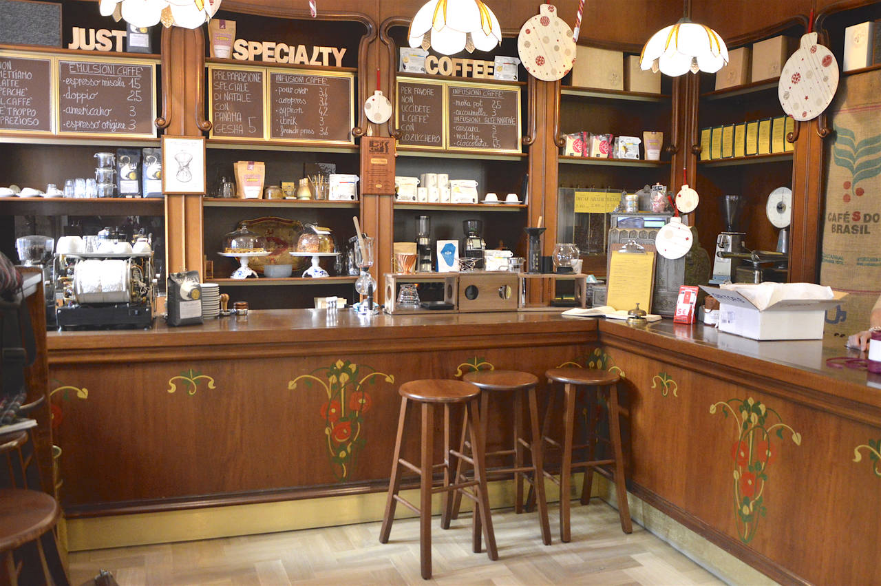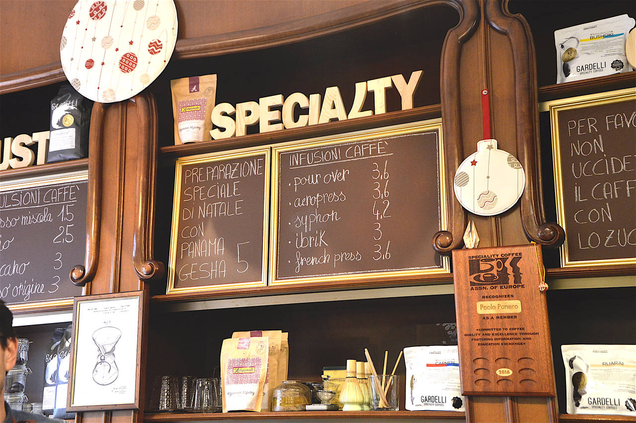 Oggi, la scritta che sormonta la scaffalatura lignea del negozio mette subito in chiaro la mission della nuova bottega “Just Specialty Coffee”. Una mission che risulta altrettanto chiara esaminando la lucente macchina espresso posizionata sopra il banco, alla quale sono stati tolti i pannelli laterali e posteriori per mostrarne l’interno, e passando in rassegna la “cassetta” degli attrezzi di Paolo Panero: V60, chemex, aeropress, french press, cold brew, ibrik. Insomma, l’occorrente per estrazioni di ogni tipo. E per non escludere nulla, all’appello risultano anche una cuccuma e l’intramontabile moka.