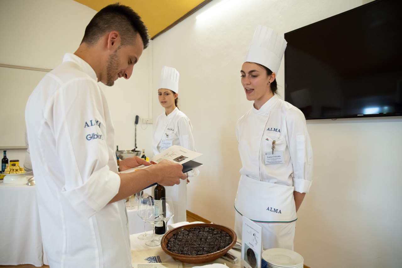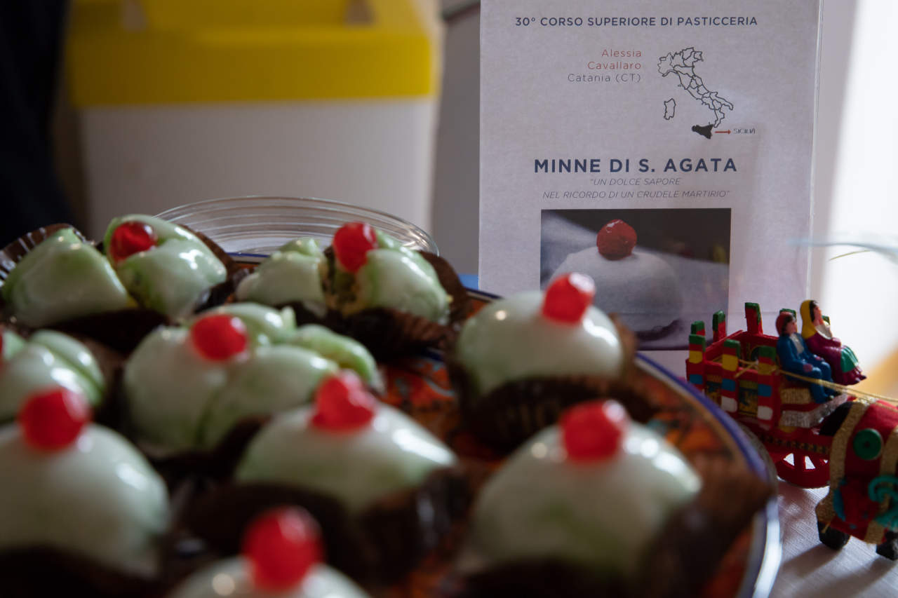 Non era obbligatorio preparare il dolce da presentare all'esame. Gli aspiranti pasticceri potevano anche comprarlo, e molti hanno scelto questa strada. Ai 50 studenti del 30esimo Corso superiore di Pasticceria di Alma - Scuola di cucina è stato chiesto, per l'esame di metà corso, di scegliere un dolce tipico della loro zona d'origine, legato in qualche modo al loro vissuto personale, di presentarlo a dovere e di abbinarlo ad un vino.