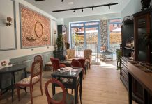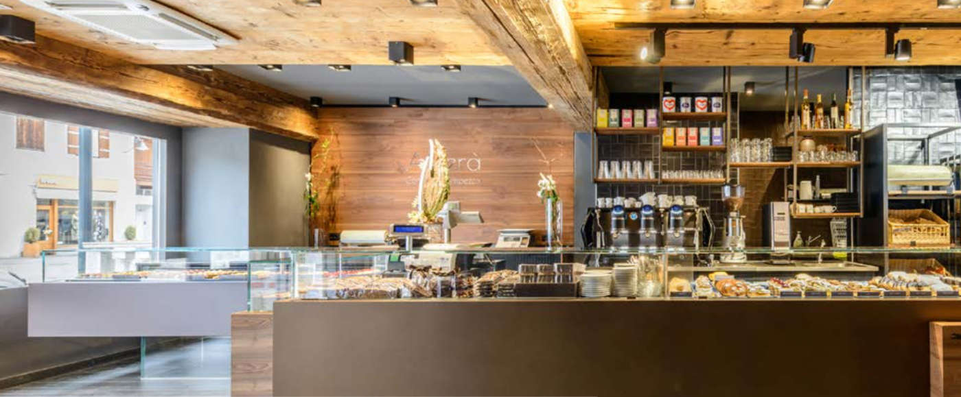 La Regina delle Dolomiti non ha così perso uno dei suoi locali di riferimento, che anzi ha acquisto maggiore visibilità grazie all’ampliamento. È stata sufficiente una ridotta palette di colori e un ampio utilizzo di legno anche su imitazione (pavimenti in grès porcellanato a doghe) per ripristinare un’atmosfera famigliare e raccolta. Al grigio antracite delle vetrine appositamente riverniciate, delle strutture in ferro di alcuni arredi o alla tonalità tortora del pavimento e delle pareti è stato contrapposto il legno di castagno nella versione spazzolata del rivestimento di banconi e boiserie o in quella a effetto invecchiato tramite essiccatura del soffitto a travi (non portanti). Qui è concentrata l’impiantistica, fra cui quella dell’illuminazione a faretti neri d’ispirazione industriale. L’area pasticceria, con macchina da caffè e cassa, si trova davanti all’ingresso per sottolineare la svolta produttiva intrapresa dalla famiglia Alverà e pur estendendosi con diversi banchi sul fondo del locale non minimizza troppo l’area dedicata al pane e ai prodotti da forno. Questa zona, pur se di superficie ridotta dopo i lavori di ristrutturazione, è stata volutamente affacciata verso il cortile laterale in comunicazione diretta con la nuovissima veranda coperta adibita a sala da tè. I prodotti freschi così come quelli di tradizione fanno bella mostra nelle vetrine anche su strada. I prodotti confezionati sono allineati sugli esili espositori a più mensole vicini agli alti tavolini con sgabelli lungo la parete d’ingresso, in modo da facilitare i flussi fra le varie zone.