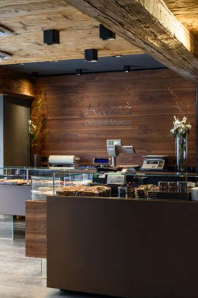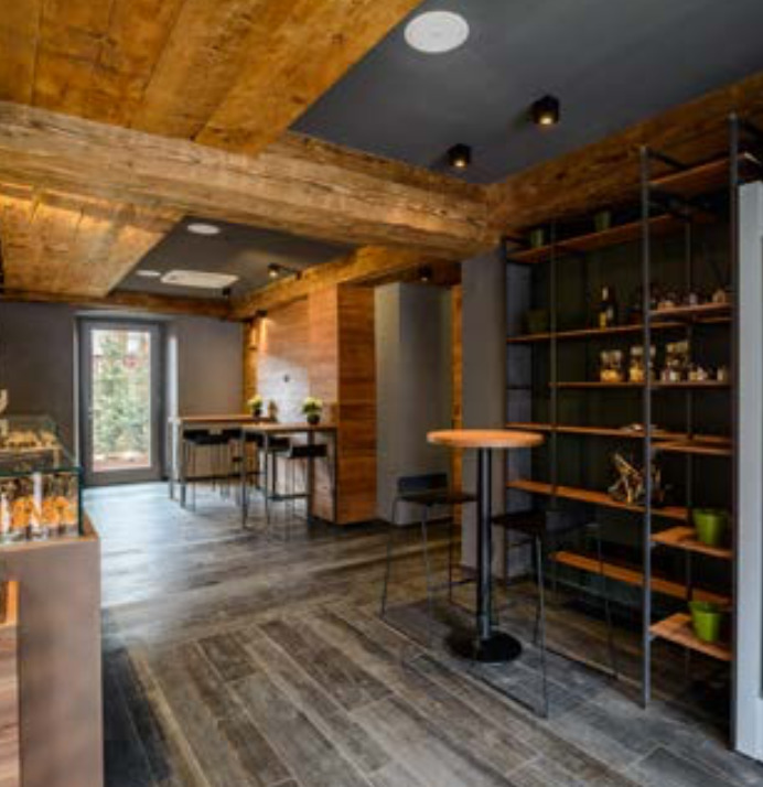 forme moderne utilizzando materiali della tradizione industriale o locale, che potessero riproporre il caldo tepore delle ambientazioni di montagna. Come il soffitto in massicce travi in larice, provenienti da vecchie case, malghe e fienili d’alta montagna, che funge da simbolo della forte identità alpina. O, ancora, la facciata principale verso il piccolo parterre, che conserva i connotati originali, a parte dal colore della struttura delle vetrine e dal ritocco del marchio.