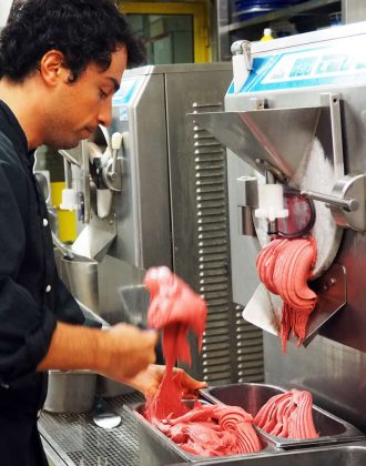 Qual è la routine del laboratorio? Produciamo quotidianamente le basi del gelato fresche. Abbiamo in linea ancora le ricette ereditate dal mio bisnonno, che abbiamo solo riadattato quando la tecnologia lo richiedeva o al massimo modificato nelle materie prime. Il Ninetto, per esempio (una specie di stecco gelato, ndr) è lo stesso da cinquant’anni. D’altra parte il romano è tradizionalista: se gli cambi il prodotto si destabilizza. Nessuno stoccaggio? Qualcosa solo per quanto riguarda torte e semifreddi. Prepariamo anche quelli quotidianamente, ma abbiamo bisogno che ci sia sempre un po’ di riserva per soddisfare le richieste. L’unico prodotto che viene preparato sempre in eccedenza sono i sampietrini, perché devono sempre esserci in stock, se mancano è un disservizio. Al contrario, per quanto riguarda il gelato, non è sconvolgente se un giorno un gusto finisce. Quante sono le linee di produzione? Sono due, una per il gelato e l’altra per i semifreddi. Nel caso del gelato si preparano le basi nel pastorizzatore e poi vanno al mantecatore. Nel caso dei semifreddi il gusto si prepara aggiungendo la panna al gusto in questione: ad esempio quello alla crema prevede che la crema sia cotta in precedenza in un cuocicrema e poi unita alla panna montata e zuccherata. I prezzi popolari vi hanno sempre caratterizzati. Mantenere i prezzi bassi, pur aumentando la qualità, è una promessa implicita che abbiamo fatto al bisnonno fondatore, che aveva lanciato il gelato per il popolo. Quando ha aperto lui c’erano le neviere, il ghiaccio costava e il gelato era appannaggio dell’alta borghesia. Oggi abbiamo il gelato a 16 euro al chilo, una scatola di sampietrini costa 9,60 euro e ce ne sono dodici, inoltre nel periodo invernale ci sono sempre delle scontistiche che ci aiutano a destagionalizzare il prodotto.
