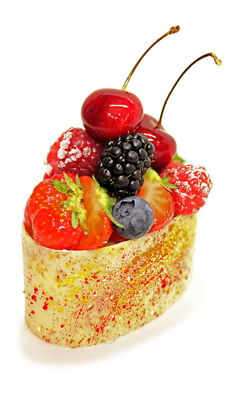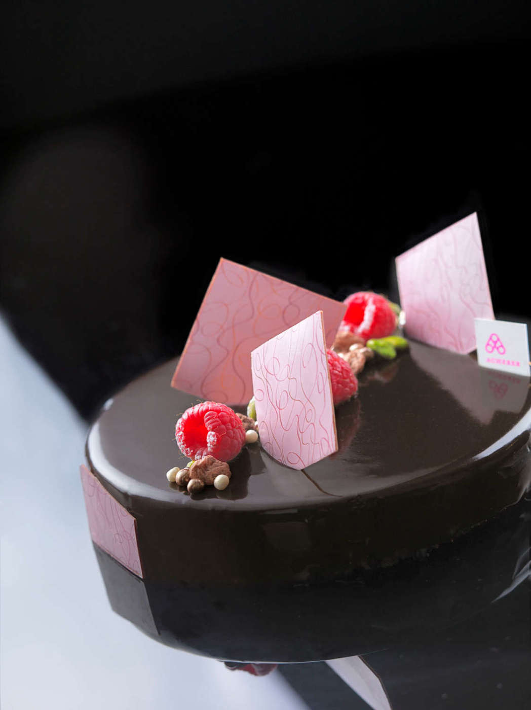 Alla base di tutto c’è una idea di pasticceria molto diversa da quella a cui il territorio era abituato fino a una decina di anni fa. «In Alto Adige trionfano dolci tradizionali e fette di torta enormi, io punto su una pasticceria raffinata, con pezzature di minima dimensione, con molta attenzione all’estetica. Da quando abbiamo aperto, vediamo tantissime altre pasticcerie che si stanno spostando su decori ed estetica, precisione e pulizia. Questo dà una mano a tutti a vendere meglio, perché è più difficile se sei da solo». Tra i dolci più rappresentativi dell’offerta di Acherer - oltre a bicchierini e cioccolatini - ci sono torte moderne come Esile fusione (torta al pistacchio con frutto della passione) o monoporzioni come Picasso (alle mandorle, con mousse alla pesca con cuore al fior di sambuco, bordo in cioccolato con spruzzi di colore e frutta fresca). O Tango, una mousse al cioccolato con pralinato di nocciole e sbriciolato di wafer, con base brownie e glassa al cioccolato e caramello. La torta simbolo è senza nome, è una mousse preparata col cioccolato âme sœur (anima gemella), sviluppato direttamente da Acherer assieme a Cacao Barry. È decorata con lamponi ed elementi sempre in cioccolato. «Utilizzo 8 tonnellate all’anno di questa miscela prodotta solo per me, per alcuni dolci, cioccolatini e tavolette. Distinguersi è fondamentale, così ho voluto creare un mio gusto personalizzato».