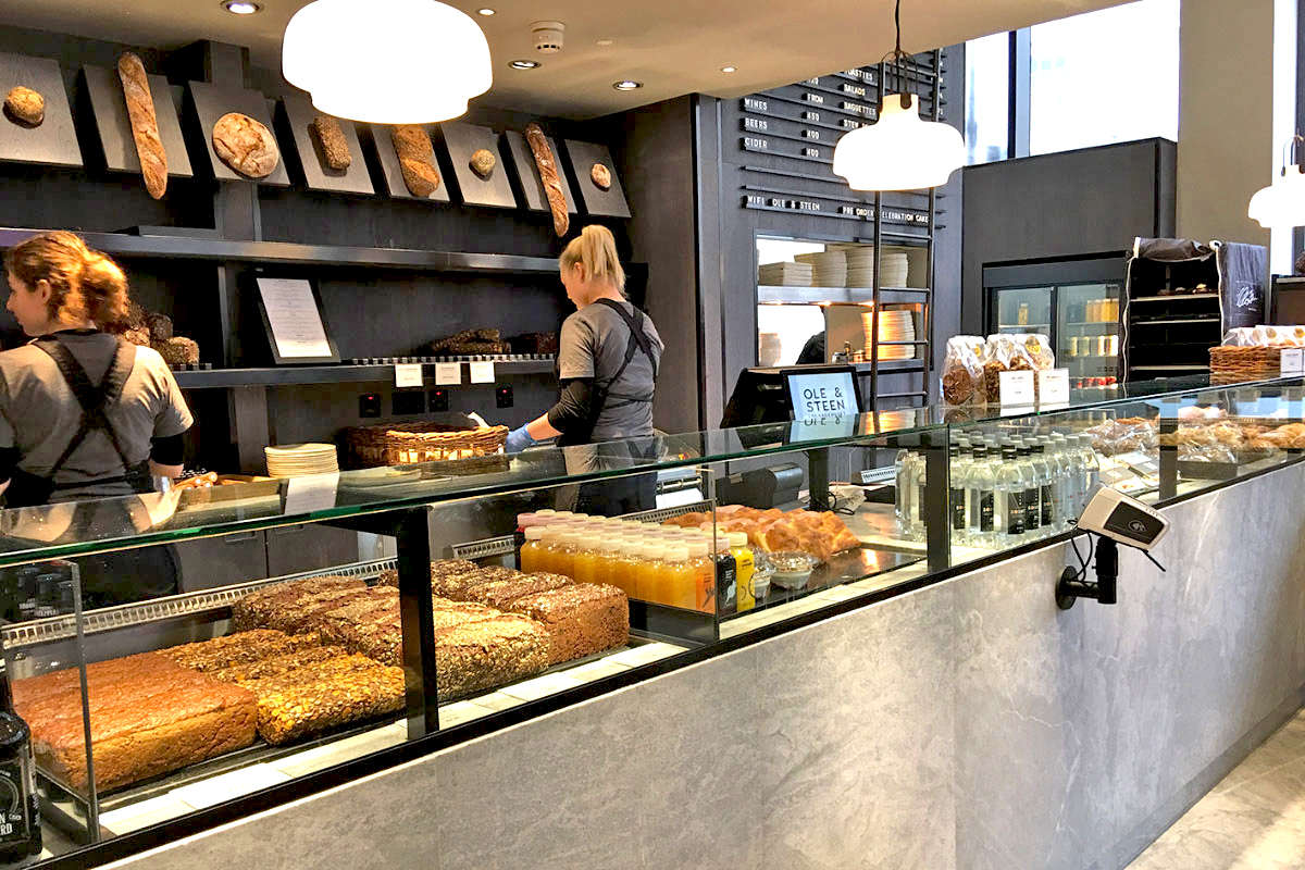 Quando entri nel pdv ti colpisce la sua eleganza semplice, insieme alla qualità e varietà dei prodotti in esposizione. L’uso del marmo bianco per il bancone contrasta con lo sfondo scuro delle pareti, che fanno da lavagna per illustrare l’assortimento. Il bancone (alto 90 cm) ha la vetrina che lo percorre in tutta la lunghezza, tranne all’inizio: qui è stata creata una postazione dove il pasticcere finisce davanti ai clienti i prodotti dolci o salati. Un addetto al banco segue “a uomo” il cliente nella scelta del food, prepara il caffè e controlla la transazione di pagamento. I canoni di esposizione dei prodotti sono ispirati a quelli delle grandi panetterie/pasticcerie di tradizione europea: grande assortimento, irregolarità delle forme, continua “sfornata” (ticket medio: 8-10 euro). Da Ole & Steen esiste una proposta di prodotti che divide, come tutti gli altri concetti fast casual, il tempo di servizio tra l’offerta di tutto il giorno e quella più legata a prima colazione e pranzo. Il pane, prevalentemente a cassetta e a base di lievito madre, farine speciali, vegetali e frutta secca, costa al pezzo 8 $. Per la prima colazione uno yogurt con granola e berries costa 5 $, croissant e simili variano dai 3 $ ai 5 $ mentre le torte monoporzioni dai 5 $ agli 8 $. A pranzo il crostone con uova e avocado costa 11 $, le insalate 9-15 $, i sandwich vanno dai 7 ai 9 $ e le zuppe sono proposte a 8 $. Un espresso vale 3 $, un americano 3-4 $.