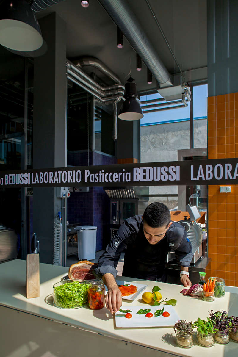 Il gelato è il simbolo di famiglia: il primo “mattone” posato nel 1992 sul quale si è sviluppata un’attività che oggi si articola su 900 mq con più linee di prodotto. Bedussi è una solida azienda famigliare guidata dai fondatori Patrizia, che si occupa del gelato ed Ermanno, che cura acquisti e amministrazione, affiancati dai figli Francesco, che gestisce pasticceria e cucina; infine Paolo, responsabile della caffetteria e della sala. Il locale, con 100 posti tra l’interno e l’esterno affacciato sul verde, dà lavoro a 20 persone. Il gelato è preparato con materie prime fresche: la crema con uova, panna e zucchero mentre per i sorbetti si usa frutta fresca di stagione. In laboratorio non si fa uso di neutri o grasso idrogenati, ma di fibre che rendono il prodotto più spatolabile e giovano all’organismo. Grazie agli studi effettuati all’Università di Scienze Gastronomiche di Pollenzo Francesco ha accumulato una formazione che lo aiuta a sperimentare e creare. Mentre visitiamo il locale ha preso il via la produzione dei lievitati natalizi, acquistati anche dal ristorante Piazza Duomo di Enrico Crippa, ad Alba. Tra le offerte più recenti di Bedussi c’è la pizza, proposta in tre impasti differenti e una quindicina di farciture a rotazione stagionale. La cucina ammicca ai gourmet, con piatti che spaziano dalle insalate al Fritto di Pesce, dal Tonno con fave e salsa teriyaki, agli hamburger Bedussi. E nel weekend è previsto un ricco brunch.