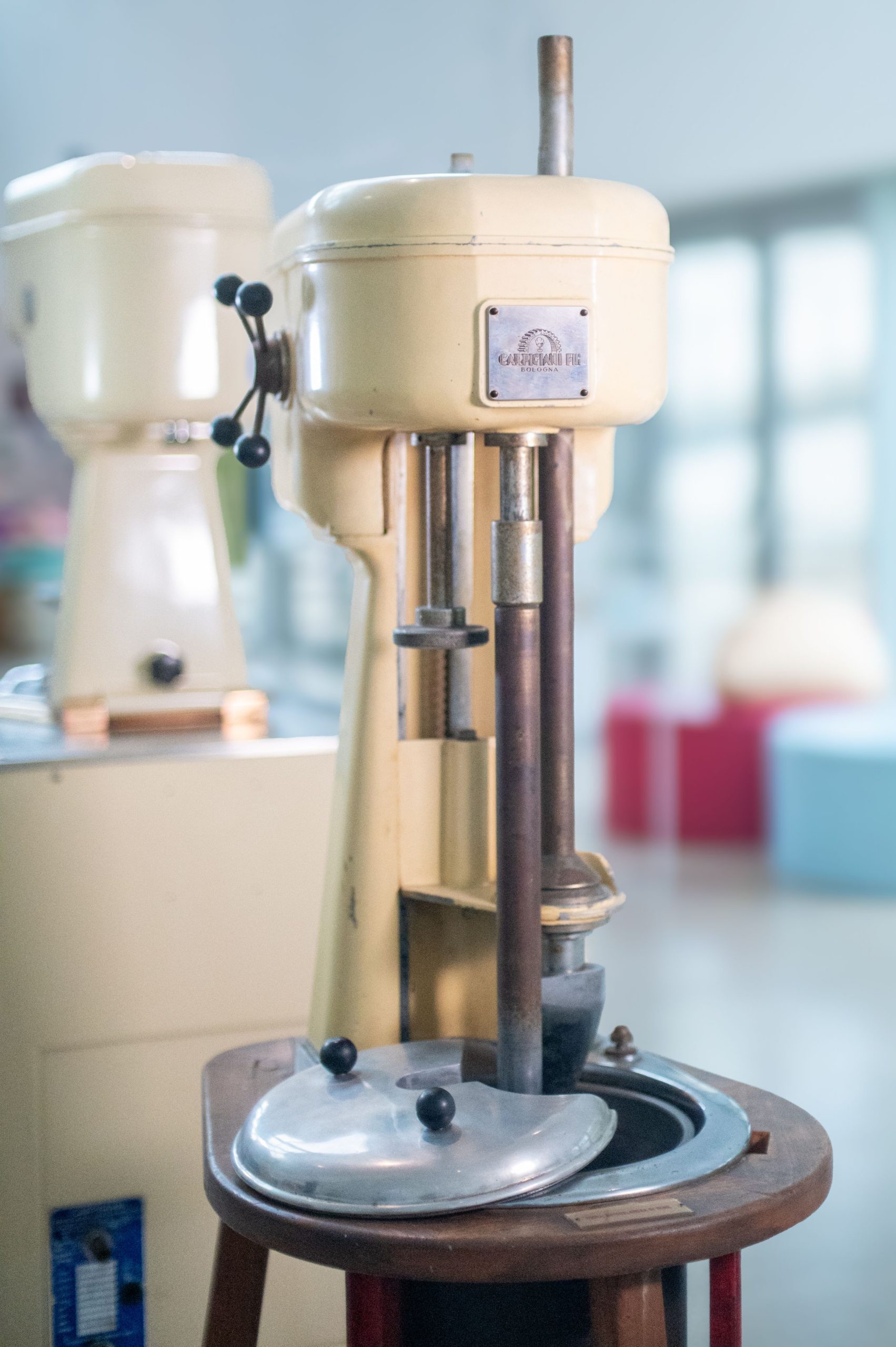 L’Autogelatiera, brevettata da Bruto e Poerio Carpigiani nel 1946, rappresentò una svolta nel settore. La macchina introduceva, infatti, un meccanismo ermetico per evitare contaminazioni e una spatola elicoidale rotativa per garantire una miscela omogenea e un processo continuo. Innovativo anche il profilo raschiante, progettato per migliorare il raffreddamento e la cristallizzazione del gelato. Con il suo design compatto e il colore distintivo chiamato "Crema bolognese”, la macchina era perfetta per l’esposizione nei negozi, aprendo nuove opportunità commerciali nel mondo della gelateria.