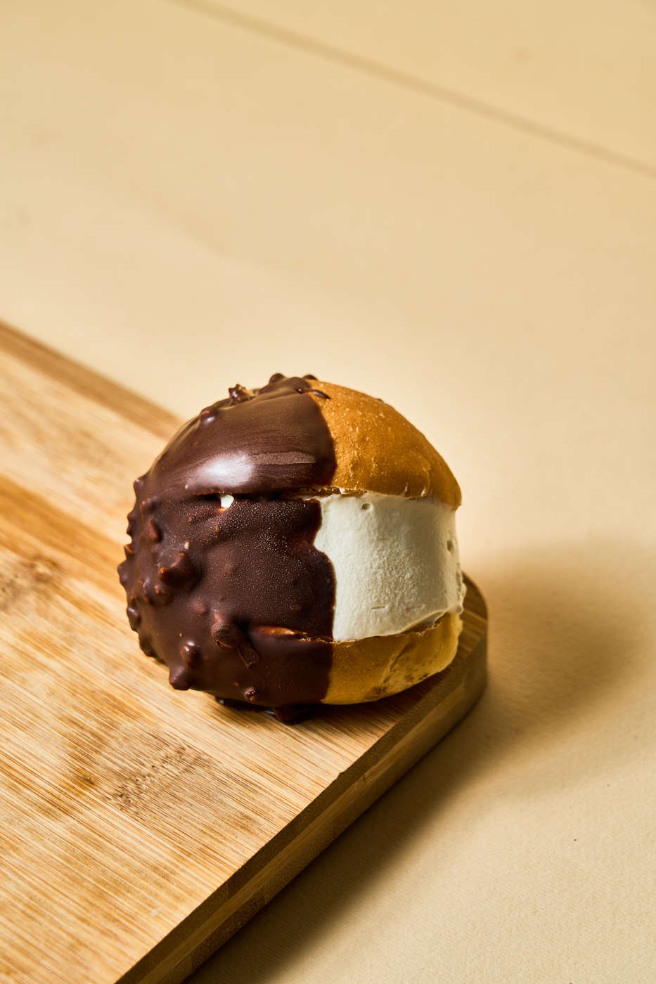 Infine, ci sono i Marineve farciti con crema pasticcera con ricotta zuccherata siciliana e glassati cioccolato fondente o al pistacchio.