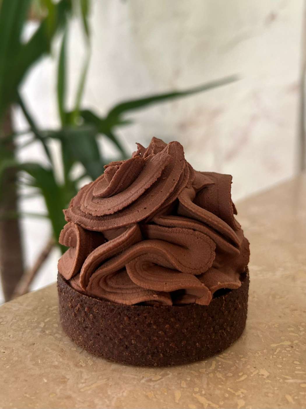 Sisu propone una monoporzione composta da una base di frolla al cacao, con crema da cottura con cioccolato 85% (Abinao di Valhrona) e una namelaka con cioccolato 66% (Caraibe di valhrona). Abinao è un grand cru, con un altissimo contenuto di cacao che ha come caratteristica principale l’amaro. Il Caraibe è sempre un grand cru ma come caratteristica un gusto molto più rotondo che rimanda a delle spezie dolci e alla frutta secca.