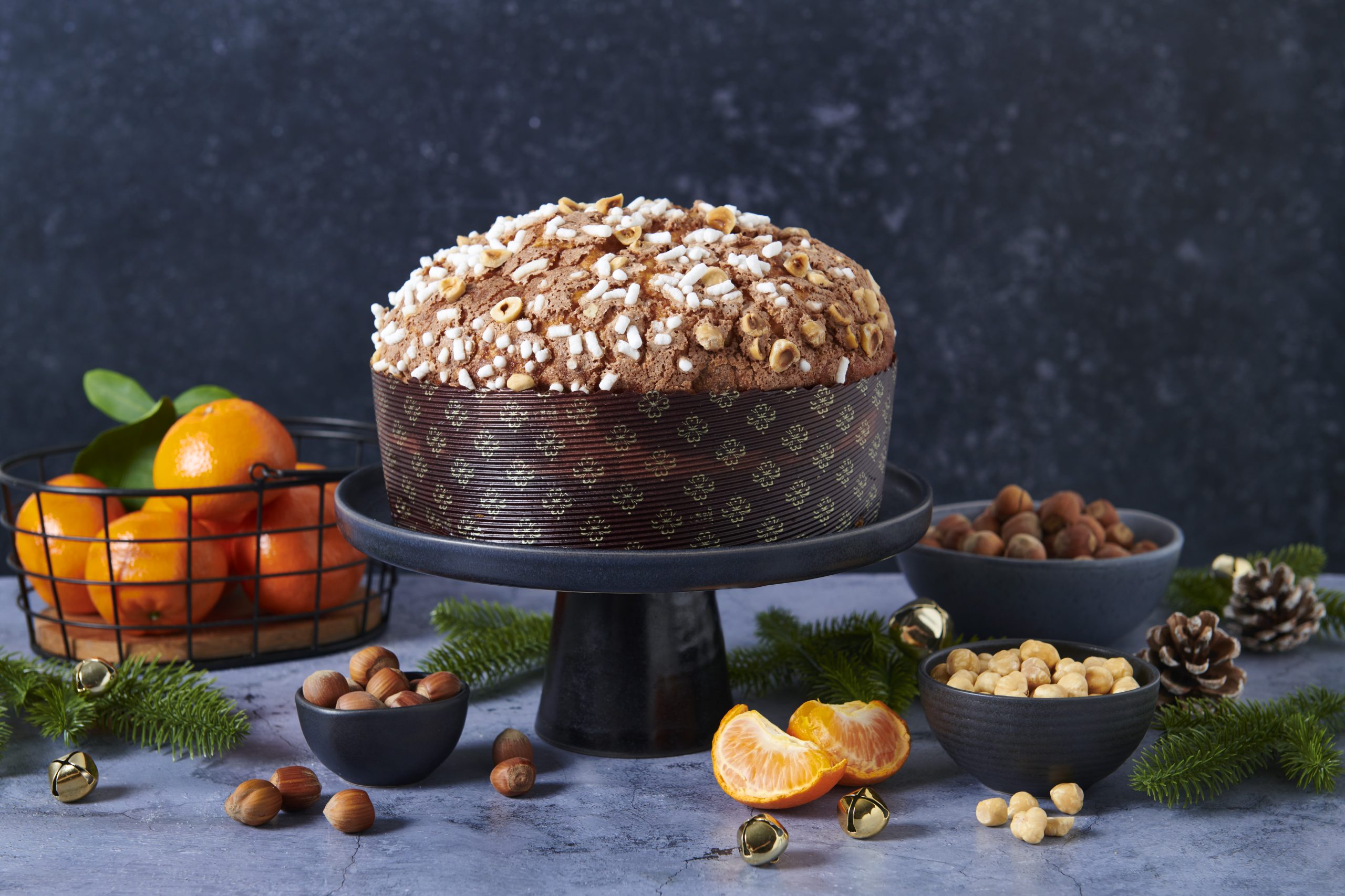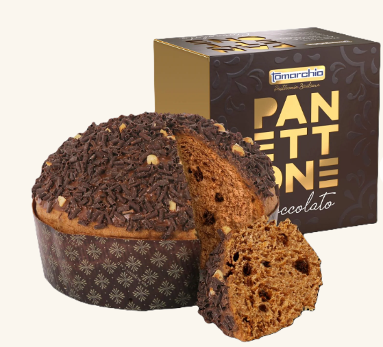 Anche quest'anno Tomarchio presenta la sua idea di panettone. Disponibile in diverse versioni, quello basso, ricoperto di cioccolato fondente, riccioli dello stesso e nocciola Tonda Giffoni, resta uno dei più golosi. L’impasto è arricchito di gocce di cioccolato fondente e al latte, ben integrate nella fetta.