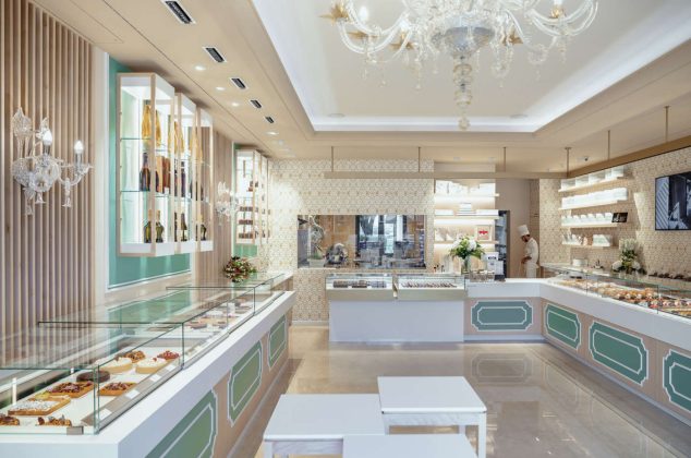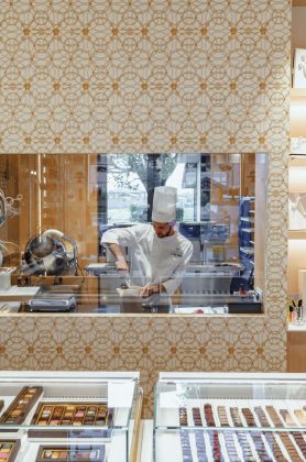 La disposizione delle aree espositive (pasticceria fresca con mignon e monoporzioni, prodotti al cioccolato e torte) crea una prospettiva privilegiata verso la parete di fondo con il laboratorio del cioccolato a vista, facilita i flussi interni e valorizza tutta la gamma dei prodotti. I grandi banchi sono semplici parallelepipedi con fronte arricchito da cornici verdi d’ispirazione classica e da frontalino in vetro Uv extra chiaro, che esalta la freschezza e la varietà della produzione giornaliera, ma anche il rigore e la precisione del metodo espositivo che è pari all’arte pasticcera della famiglia Cortinovis. Il verde tenue che viene riproposto come fondale degli espositori a parete e sul fronte delle celle frigorifere verticali è il delicato leitmotiv che interrompe e rende più calda l’ambientazione della zona vendita (70 mq), dominata dalla tonalità bianco/avorio di superfici orizzontali (il pavimento è in lastre 70x70 cm in grès porcellanato lucido) e verticali. Tavolini di varie altezze e lunghezze con esile struttura in acero naturale e piano in Corian arredano le vetrine e lo spazio centrale con la funzione di espositori o piano d’appoggio per la consumazione in piedi. Dell’equilibrato gioco fra linee contemporanee e richiami classici fa parte anche la soluzione della carta da parati a motivi geometrici (gli stessi del packaging) che decora due pareti e l’illuminazione lineare a sospensione concentrata sui banchi del cioccolato e delle mignon. Ottone satinato e illuminazione artificiale mirata (faretti a incasso, piani retroilluminati e sospensioni) mettono l’accento su particolari e prodotti, i veri rappresentanti del valore del marchio, riproposto solamente nell’insegna esterna e nel pannello con il nuovo logo (un cappello da pasticcere stilizzato) su una delle pareti interne.