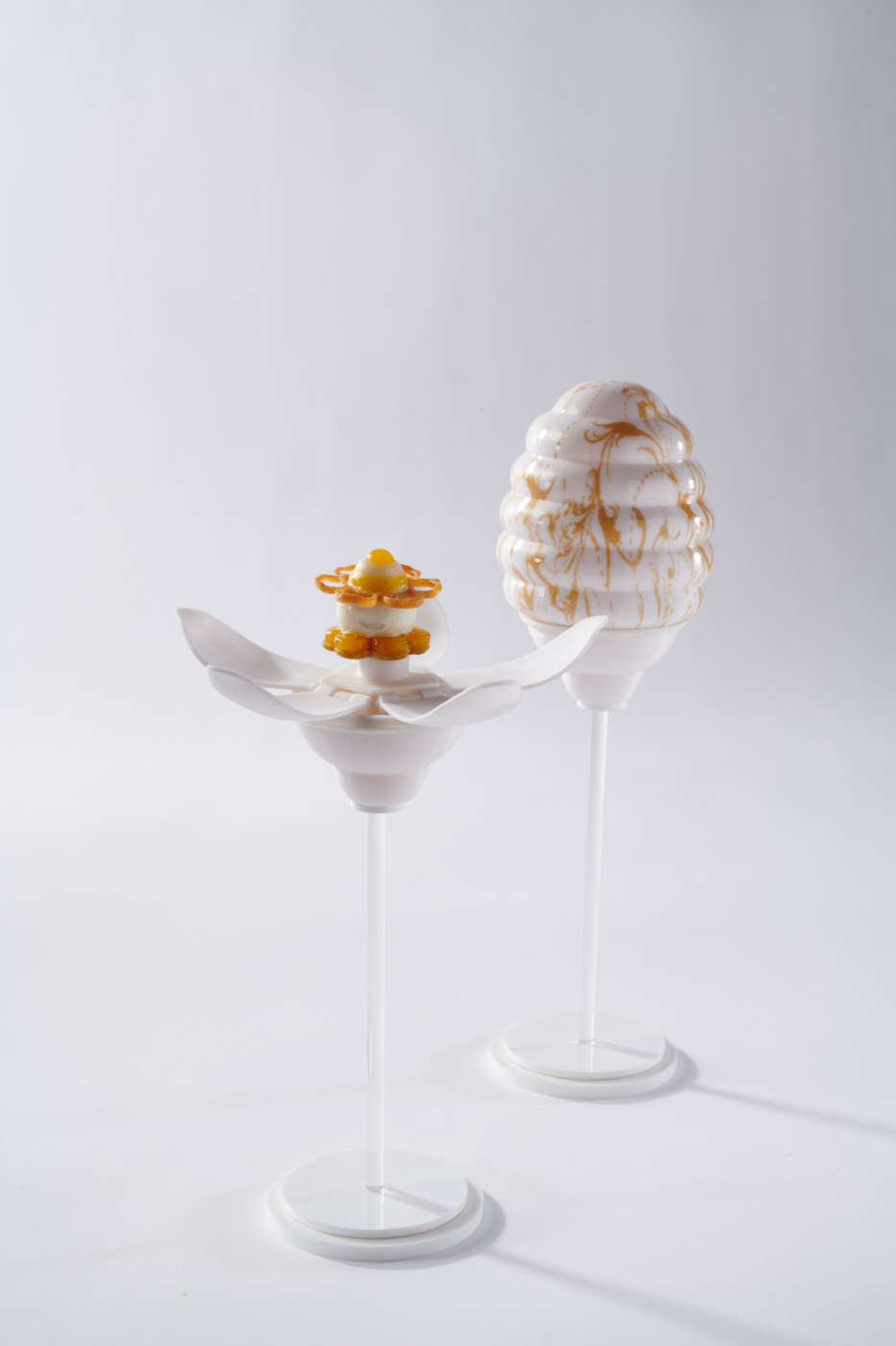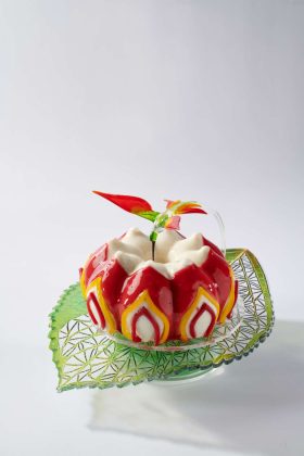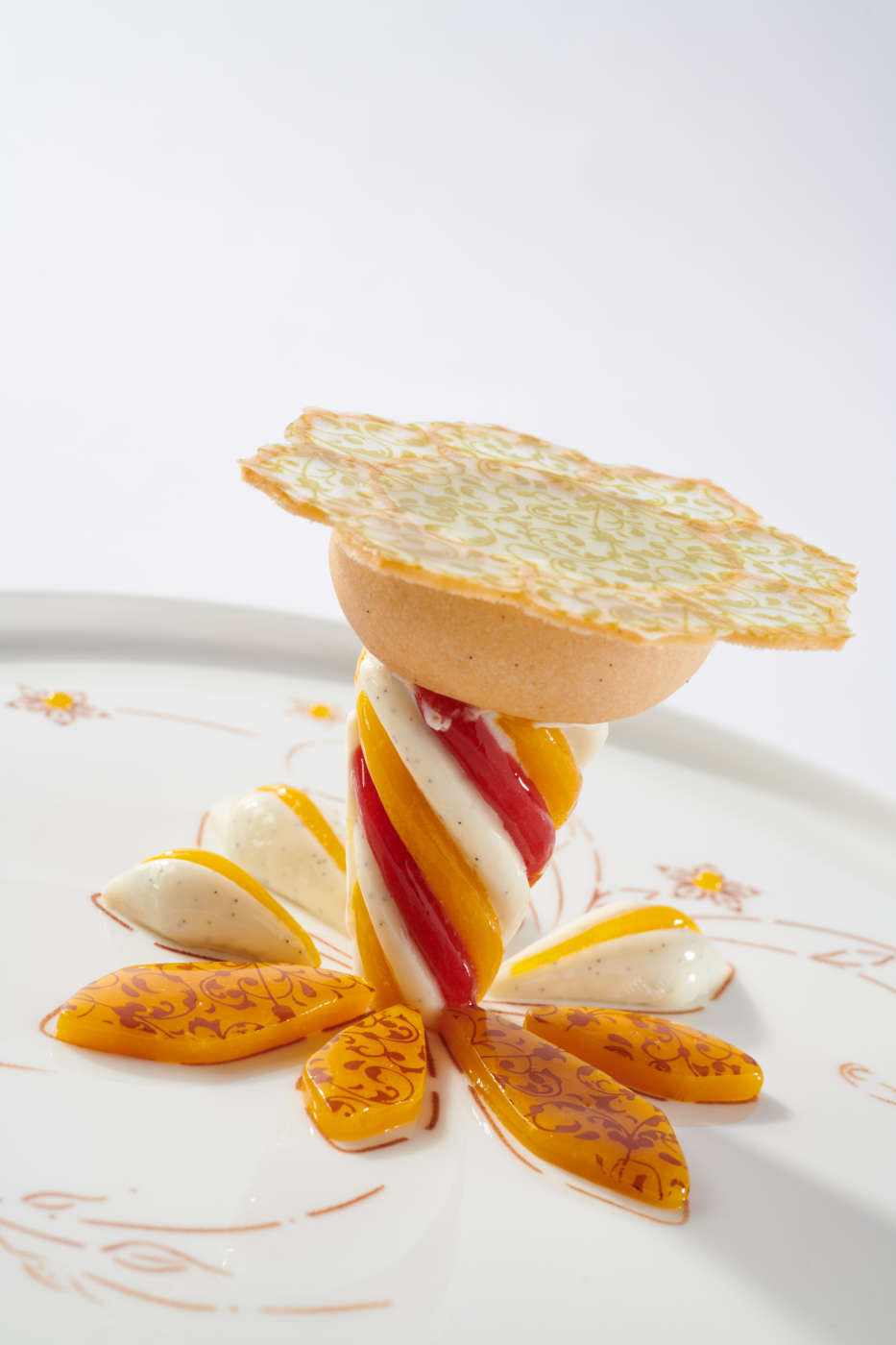 Composto da una massa serigrafica verde al tè matcha e da glassa trasparente bianca, con gelato fior di panna, mascarpone, vaniglia e lime, al suo interno questo dessert contiene una dadolata di mango, con cialda croccante, salsa ai frutti rossi e lime, e gel di fragola e lampone . Segue un biancomangiare alle mandorle. I petali sono composti da gel di mango e frutto della passione al profumo di arancio, una parte decorata con ganache alla mandorla e vaniglia, e l'altra parte realizzata con massa serigrafica al cacao. Il tutto realizzato con la messa a punto della tecnica di trasparenza, molto simile al vetro, data dalla cialda a forma di fiore in chiusura superiore del dessert.