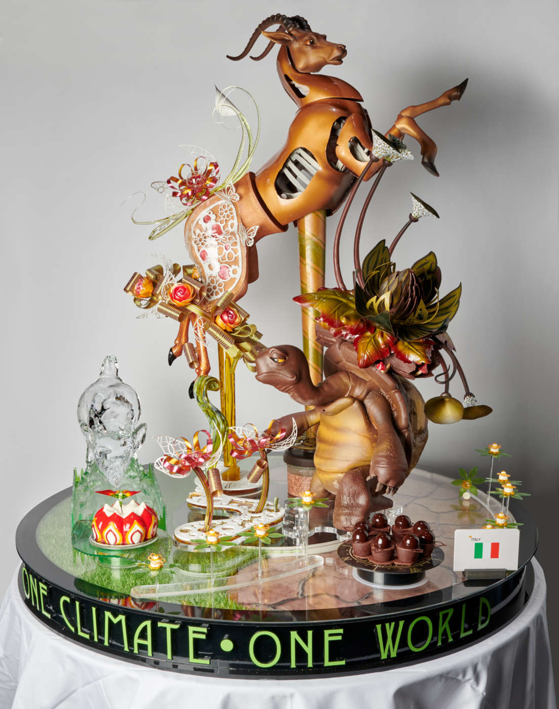 Il Team Italia ha interpretato con estrema bravura e cura nei dettagli il tema della gara nel buffet, raffigurato da un'antilope (pièce di cioccolato) che salta da un terreno rigoglioso e verde ad una natura morta, secca e arida, così com'è il cambiamento inevitabile e costante del clima. Il lavoro certosino della squadra è visibile nelle costole ben evidenti dell'antilope, segno di pericolo incipiente, data appunto dal cambiamento climatico. Ad arricchire la "scenografia" una tartaruga che, raffigurata stanca e affranta, porta su di sé il peso della natura morente: foglie, fiori e rami realizzati con diversi materiali plastici e varie tecniche di lucentezza. L'animale cerca di portarla in salvo verso la parte rigogliosa (pièce di zucchero), guidata da una bussola rappresentata dalla torta al cioccolato. Nella parte del mondo fiorente, inoltre, è rappresentato un cucciolo di antilope (pièce di ghiaccio) che gioca con la torta gelato. A chiudere il buffet, un fiore con un'apertura di quasi 40 centimetri, caratterizzato da un effetto ottico molto particolare dato dagli svariati puntini di cioccolato presenti in esso.