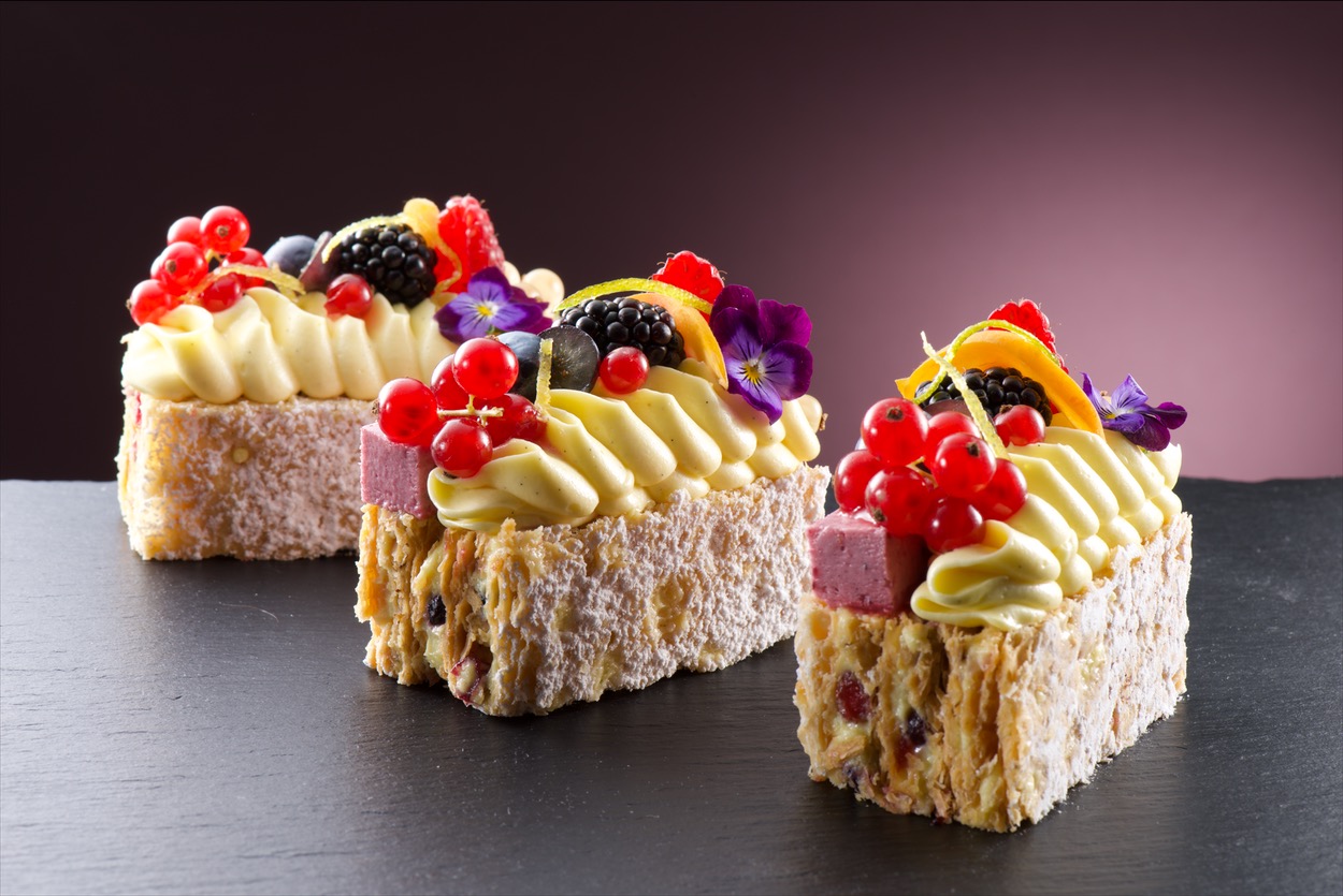 È un grande classico della pasticceria italiana interpretato dall’estro creativo del Maestro pasticcere. Millefoglie ai frutti di bosco è una pasta sfoglia con crema pasticcera al cioccolato bianco e vaniglia, frutti di bosco semicanditi e mousse ai frutti di bosco.