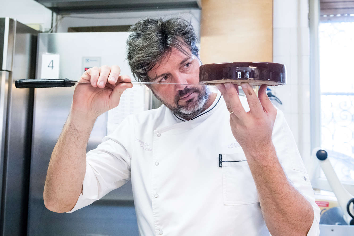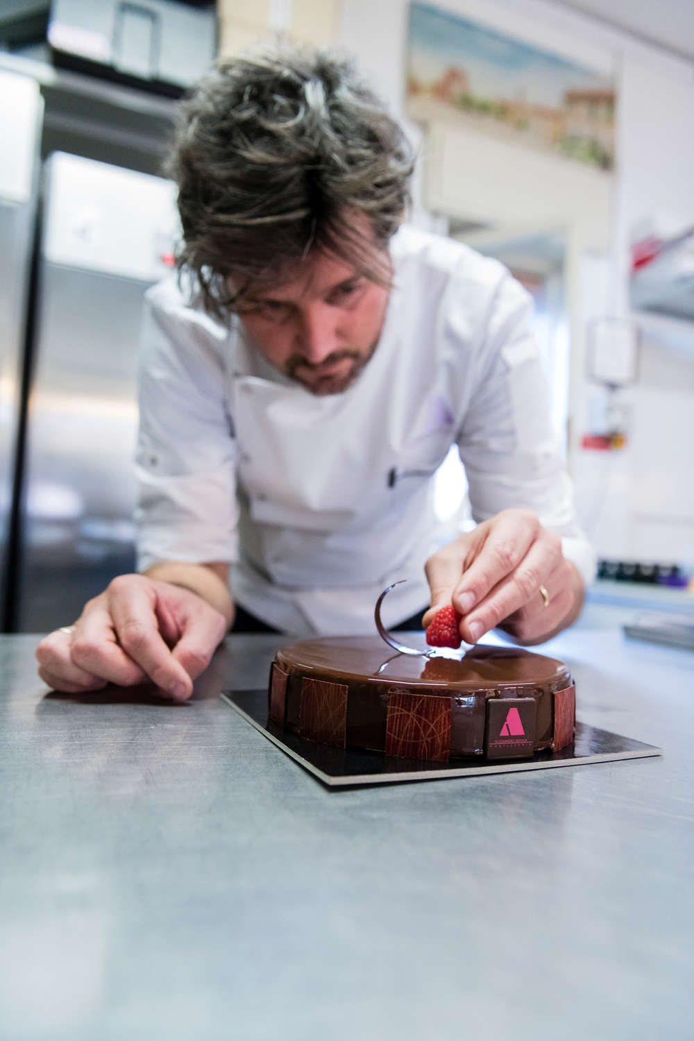 Lo hanno soprannominato “il pasticcere spettinato” per la chioma ribelle e lo stile scapigliato e anticonformista. Per il suo amore per le moto e lo spirito da globetrotter. In una parola, rock. Ma Alessandro “Alex” Servida (visita il sito della pasticceria Servida cliccando qui), 43 anni di Pantigliate (Mi), è un titolato professionista, anche se a questa maturità professionale è arrivato dopo un percorso in un certo senso anomalo – niente scuole alberghiere per lui, che ha iniziato da autodidatta – che dal 2013 fa parte dell’Accademia Maestri Pasticceri Italiani, una delle associazioni più accreditate e di cui fa parte il gotha della pasticceria nazionale. Oggi, con vent’anni e più di esperienza, ci presenta la torta Donatella, dedicata alla moglie: una delle creazioni di successo della pasticceria Alex e che rappresenta una tappa significativa nel percorso professionale di Servida. «Il dolce è dedicato a mia moglie - spiega - perché lei è stata veramente una molla propulsiva per la mia carriera, incoraggiandomi e sostenendomi. Questa è la torta che ho presentato all’esame di ammissione ad Ampi: è riuscita molto bene ed è diventata il nostro cavallo di battaglia. Si tratta di un dolce composto da strati alternati di biscotto morbido al pistacchio, cremoso al cioccolato, veli di cioccolato croccante, gelée ai lamponi e mousse al cioccolato, il tutto ricoperto dalla glassa di cioccolato. Oggi l’abbinamento frutta-cioccolato lo diamo per acquisito, ma qualche anno fa era una novità. Io sono partito dall’idea di alcuni colori belli da abbinare, per poi trasformarli in questa torta che produciamo in tre formati: torta, monoporzione e mignon (la pasticceria è in vendita a 35euro/kg, ndr)». Tre formati in cui, poco per volta, si troveranno in produzione tutte le torte (circa una ventina al giorno le torte vendute, in formato da 6 o 8 porzioni). «Sono aumentati i single, è cresciuta la voglia di gratificare se stessi. Così la monoporzione ha preso piede - spiega il pasticcere - anche in un piccolo paese come il mio. Un cambiamento nei consumi che ha consentito di spostare la classica vendita del sabato e domenica a tutta la settimana».