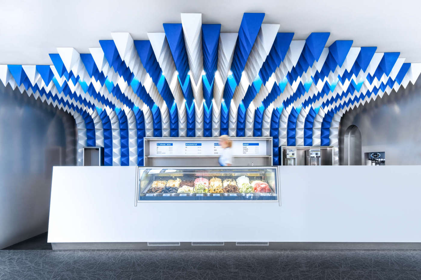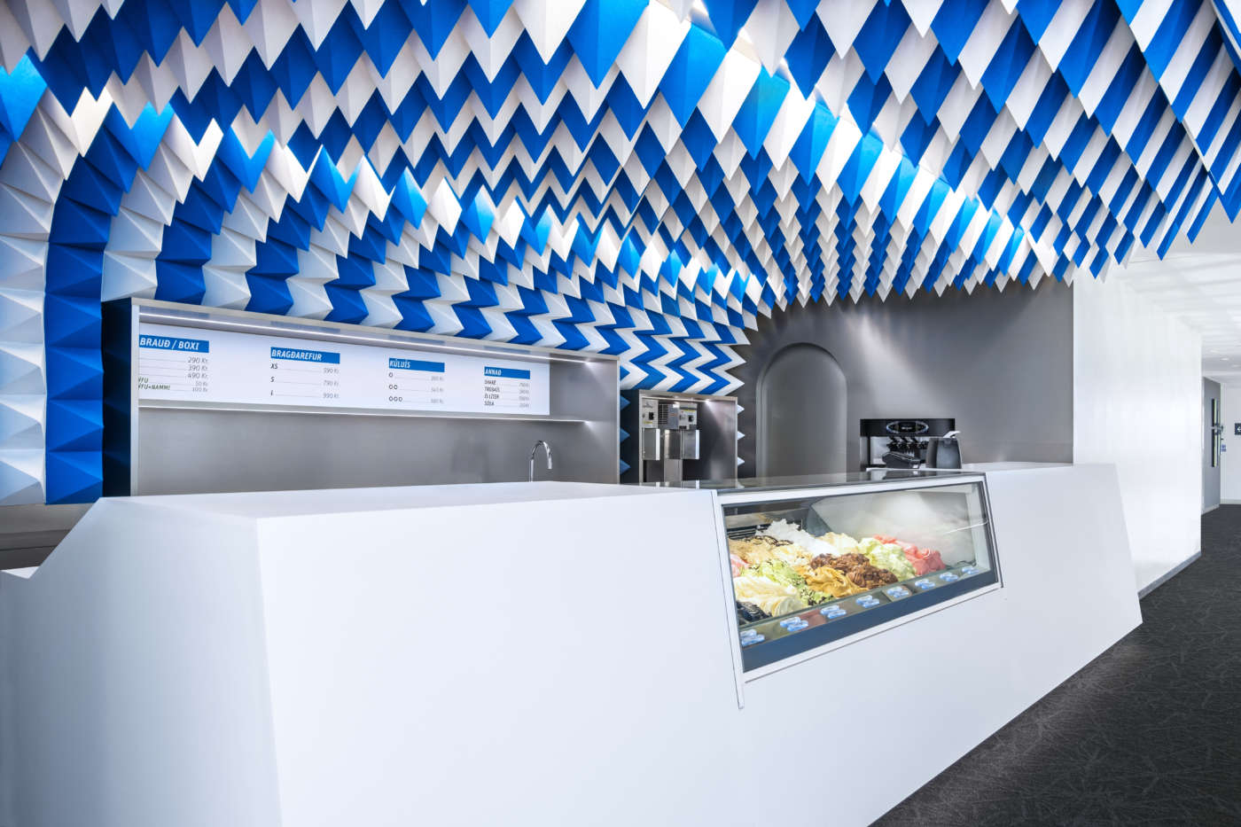 REYKJAVIK (ISLANDA). I musei negli ultimi decenni hanno subito una progressiva evoluzione affiancando alla componente culturale la dimensione economica-aziendale. Sempre di più i singoli musei grazie all’autonomia di gestione, puntano alla valorizzazione delle eccellenze, al miglioramento degli standard di qualità, a nuove strategie di marketing e comunicazione e all’esternalizzazione di alcuni servizi quali bookshop e attività di ristorazione. Il museo Perlan a Reykjavik, dedicato alle vicende e alla storia del popolo islandese, ha ampliato la propria offerta gastronomica, che ora comprende, oltre al ristorante con vista panoramica sulla città, una gelateria. La forte identità della gelateria Perlan è stata studiata dall’Atelier Tobia Zambotti, facendo ricorso a una soluzione semplice ed economica, ma di grande impatto emozionale. Il soffitto in continuità con la parete di fondo diventa il principale elemento compositivo di uno spazio immersivo e dinamico, grazie al caleidoscopio di forme e colori in bianco e blu. La miriade di piramidi in spugna fonoassorbente che scendono dal soffitto, come stalattiti astratte, crea un’illusione ottica verso il punto focale della vetrina dei gelati, incastonata all’interno di un monolitico bancone in corian bianco. L’iconicità di un solo elemento di design è sufficiente a definire l’atmosfera e a dettare i parametri di tutti gli altri elementi, dalla porta di servizio a tutto sesto, che segue la forma del soffitto, al lungo bancone, come richiesto dalla stessa committenza. Il pattern del soffitto, che reinterpreta lo scenario naturalistico islandese delle grotte nei ghiacciai, con i loro riflessi e colori in continuo mutamento, da una parte è enfatizzato dal back-counter in acciaio inossidabile che riflette la luce “glaciale” da 4500K delle strisce led, dall’altro dalla mancanza di oggetti a vista (cassa, attrezzature, ecc.) e dell’assenza del rumore dei frigoriferi, grazie all’utilizzo di materiale fonoassorbente per le superfici.