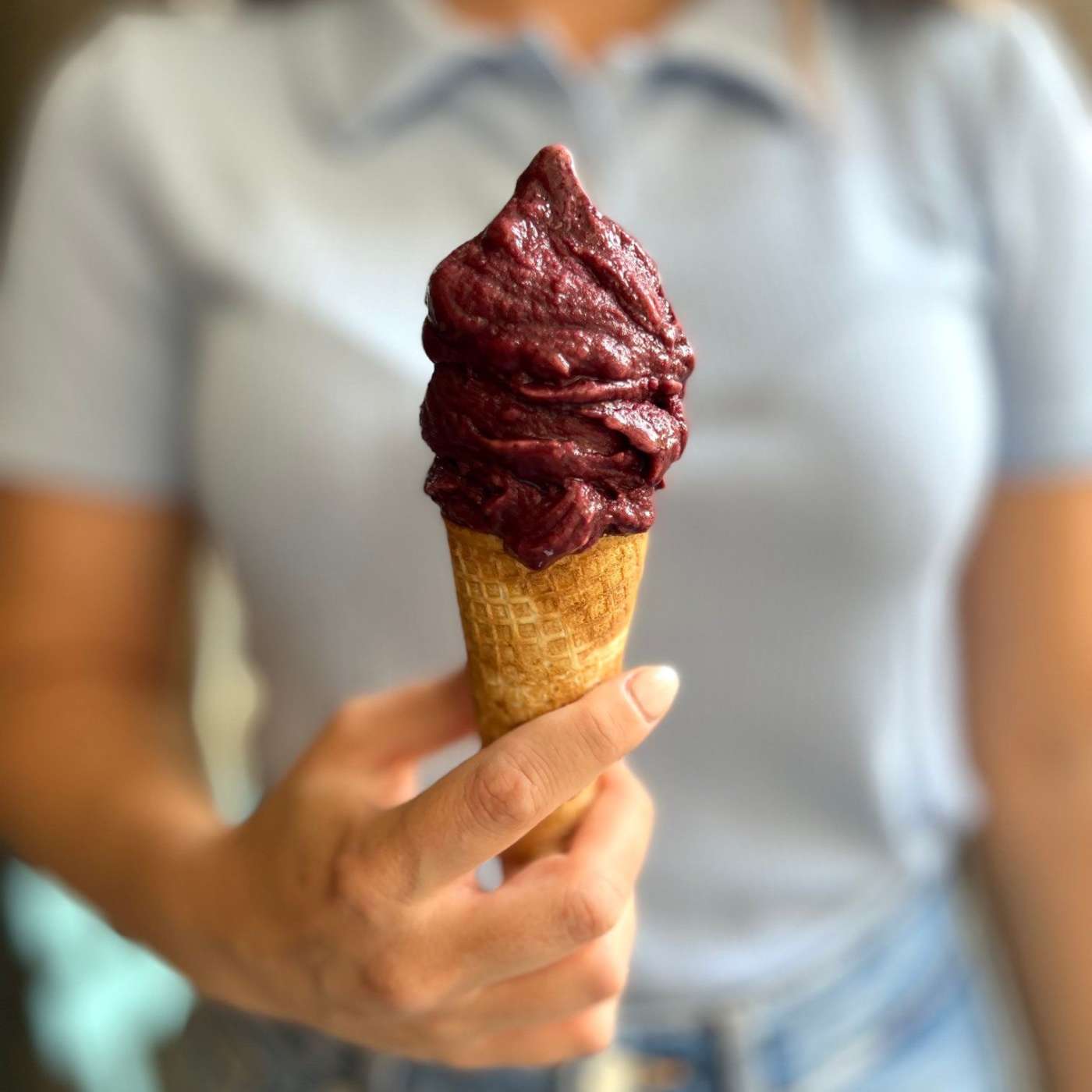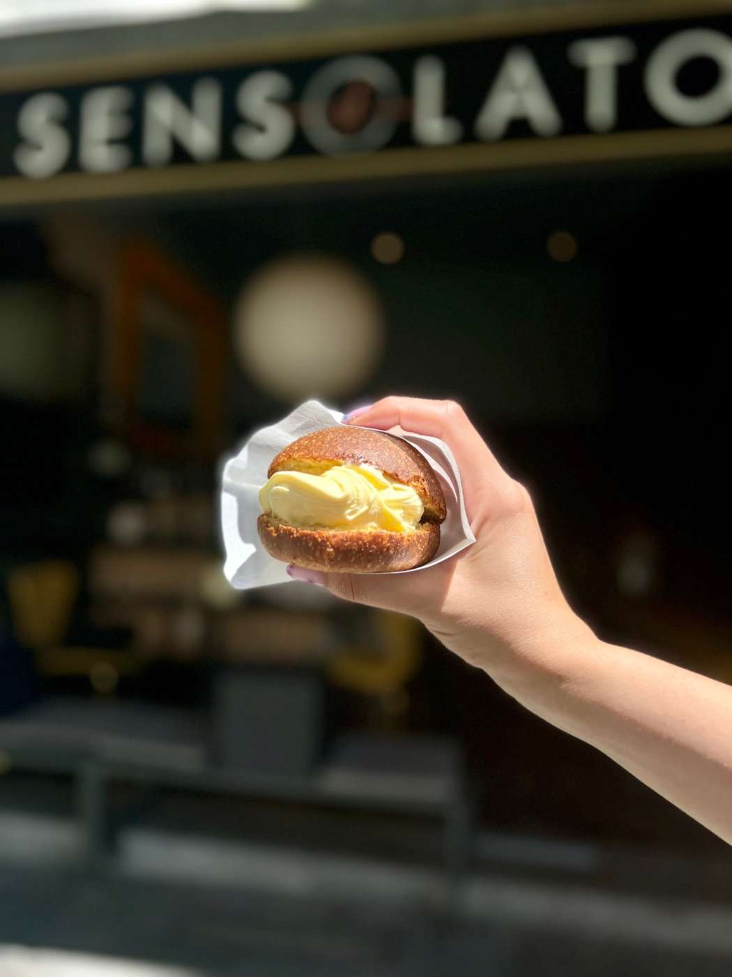 Il servizio è curato anche nella composizione dei contenitori: la plastica è stata eliminata e tutto è compostabile, dalle coppette ai cucchiaini ai tovagliolini. Non ci sono bottiglie di plastica, ma le borracce termiche in acciaio con il logo SensoLato di una startup della zona, Neh Italia: a ogni acquisto una parte del ricavato viene donato a un progetto di riforestazione e in ogni momento si può riempire il contenitore con acqua microfiltrata naturale o frizzante. Da parte sua Marco Lugarà procede la sua ricerca seguendo coordinate ben precise: «Dico sempre che non si può avere un buon gelato senza una materia prima eccellente e una conoscenza tecnica approfondita che permetta di ottenere il risultato finale desiderato. Quest’anno ho deciso di approfondire la ricerca e proporre i gusti del territorio, come le more di gelso, con cui abbiamo realizzato una granita, o il gelato al fieno d’alpeggio, con il buon profumo di erba tagliata che si respira durante le camminate estive in montagna. Esco di più dal laboratorio per confrontarmi con le persone, cogliere i loro gusti, comprendere le loro esigenze e scoprire se la base tecnica sulla quale sviluppo le diverse preparazioni è in grado di soddisfarli. Il gelato è forse più complesso da spiegare sui social, mentre la sua presentazione è immediata nel punto vendita e il cliente è più aperto alla prova, all’assaggio».