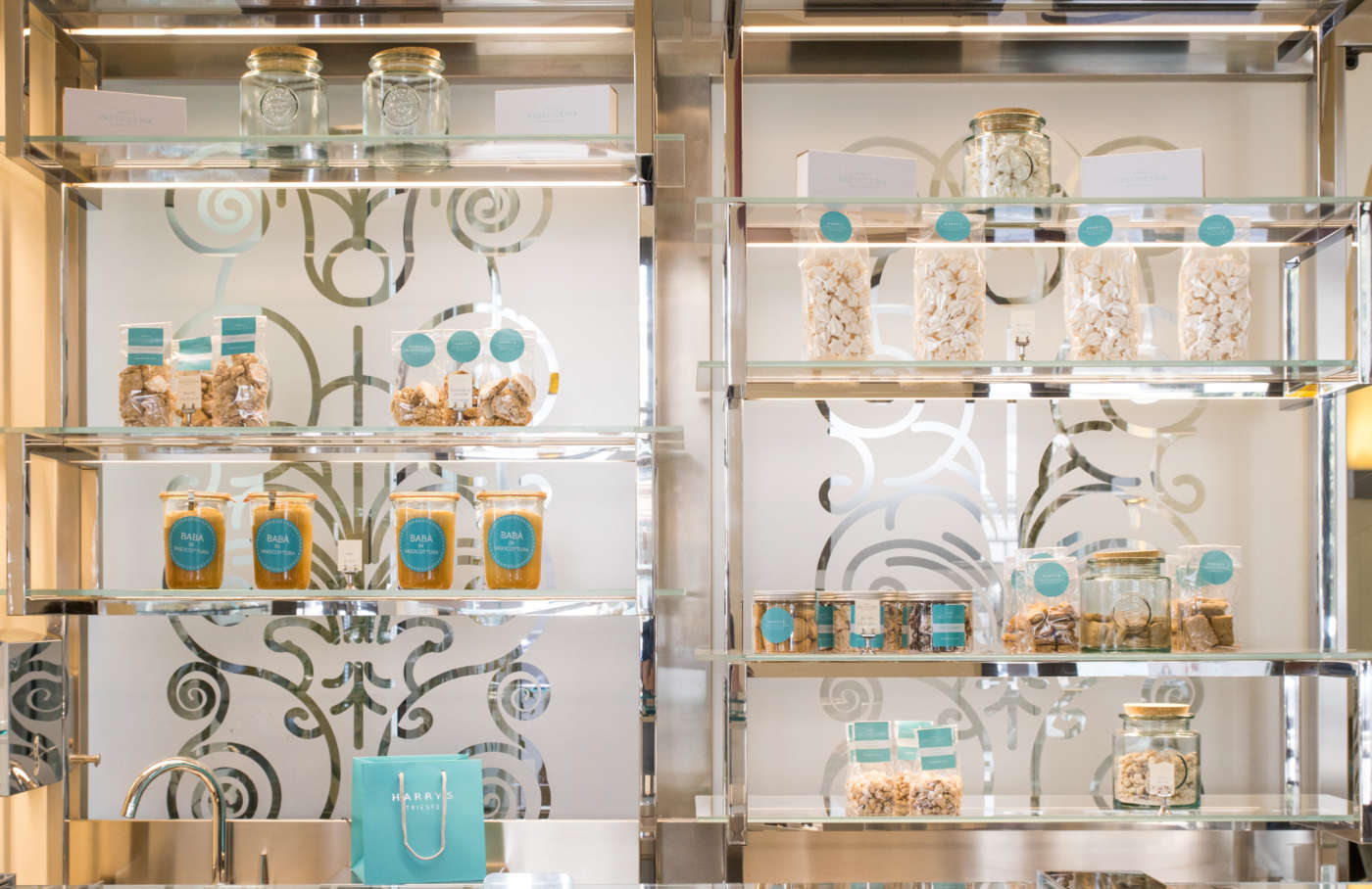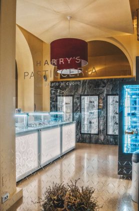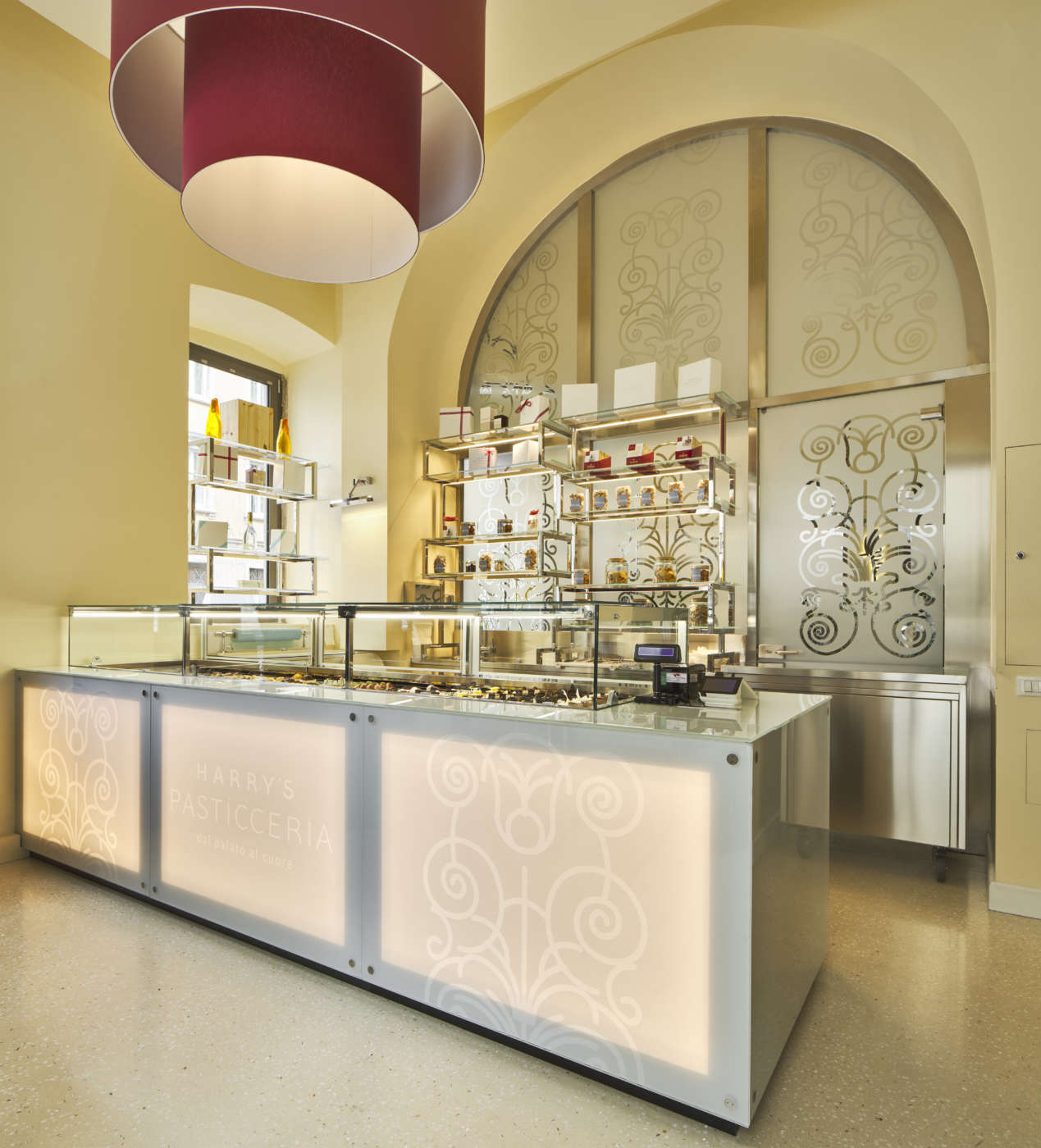 Il locale, pur di metratura contenuta, riprende l’atmosfera preziosa che caratterizza la ristrutturazione dell’hotel firmata dall’architetto Rossella Erika Gerbini. Uno spazio “burroso” non solo per la tipologia di prodotti ma soprattutto per la particolare tonalità di smalto utilizzata per pareti e soffitto. La considerevole altezza del locale (6 metri) e l’ampio utilizzo del vetro rendono grande Harry’s Pasticceria più di quanto venga percepita dall’esterno. Dalla strada è immediato il richiamo offerto dalla piccola vetrina-finestra, con gli eleganti espositori geometrici e il raffinato packaging delle confezioni. Il mood è quello di una gioielleria che mostra i suoi pezzi più preziosi e l’allestimento interno lo ripropone utilizzando due soli grandi blocchi squadrati: il bancone espositore+retro bancone di vitrea trasparenza, che contrasta con il massiccio armadio frigorifero di colore grigio incorporato nell’arco a confine con la struttura alberghiera. La linearità degli elementi è arricchita di dettagli, materiali e finiture ricercati: vetro sabbiato e retroilluminato per il fronte del bancone con la riproduzione delle grate del palazzo del Comune, che fa da sfondo alla piazza sul mare; doppio vetro con pellicola interna a disegno per la grande vetrata che divide la zona vendita (asporto) dal laboratorio; acciai spazzolati per espositori, profili dei serramenti e attrezzature del retro bancone; pietra sinterizzata grigia per il rivestimento delle vetrine frigorifero a parete (torte, monoporzioni, pasticcini ecc); terrazzo alla veneziana con inserti di marmi bianchi, madreperla e resina per il pavimento. Una composizione materica che - al pari delle superfici vetrate e del trattamento a smalto delle parti murarie - aumenta la rifrazione della luce dilatando le dimensioni interne. Spetta al grande lampadario rosso posto al centro dello spazio il compito di focalizzare, al di là degli effetti evanescenti dei espositori in vetro, l’attenzione del cliente sui prodotti, le materie prime e la loro presentazione.