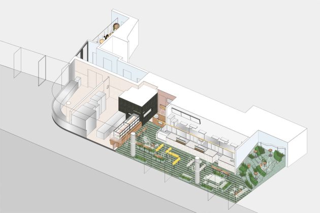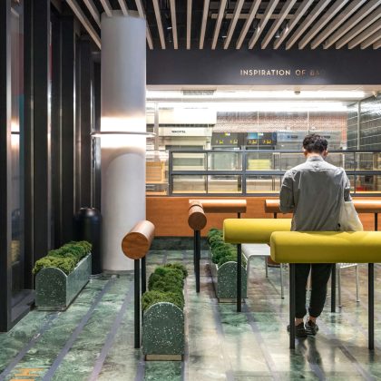 Hangzhou (Cina). La cultura del tè in Cina ha una storia millenaria, fatta di riti di grande bellezza, tramandati di generazione in generazione e consumati in un’atmosfera di lenta contemplazione. La cittadina di Hangzhou ricca di storia e di arte e un tempo considerata una delle sette capitali della Cina, è famosa per il suo tè Longjing, e per le sue splendide tea houses lungo il lago dell’Ovest dove è possibile degustare una tazza di tè secondo i riti tradizionali. In questo contesto la cultura del tè incontra il progetto di Heytea firmato dallo studio Nota architects: un panificio-pasticceria che trae ispirazione dalle piantagioni di tè che si trovano in montagna e che affianca ad una dimensione più dinamica una più meditativa e rilassante, offrendo anche l’opportunità di godere di una sosta piacevole e stimolante in un ambiente decisamente inusuale. Dall’esterno lo spazio sembra animato da una forte contemporaneità, ma al suo interno Heytea assume una connotazione decisamente più accogliente e invitante. La scelta dei materiali e delle tonalità di colore giocano appieno il loro ruolo primario e ricreano un’atmosfera più calda, fatta di elementi che evocano una naturalità propria dei giardini del tè.