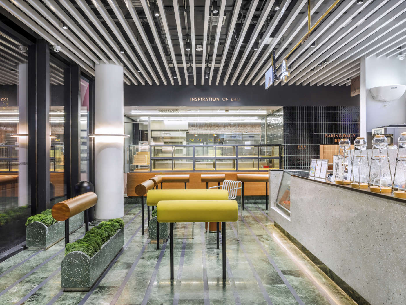 Al suo ingresso, il locale è palesemente strutturato secondo un’organizzazione spaziale molto attenta e tale da permettere ai clienti di muoversi in maniera funzionale, secondo tre flussi di movimento: quello diretto al panificio, quello diretto al grande bancone delle bevande e quello della consegna per chi predilige il take away. Tutto questo è reso possibile dall’installazione di una serie di pratici elementi a media altezza, in legno e in tessuto, pensati, oltre che per distribuire il flusso dei clienti, anche per garantire ai clienti un comodo appoggio durante l’attesa in coda.  Al colorato pavimento in marmo verde Alpi alternato a lunghe strisce in pietra grigia, si contrappone il rivestimento del bancone vendita dalle tonalità neutre che richiama il sistema di listelli bianchi di legno che ricoprono l’intero soffitto. Sulla sinistra, prende forma il banco della panetteria in parte rivestito in legno e dotato di grandi vetrine dove vengono esposti giornalmente i prodotti in vendita. A fianco di esso una parete completamente piastrellata di nero lascia intravedere da una piccola finestra un angolo del laboratorio retrostante, dove lavorano incessantemente i fornai.