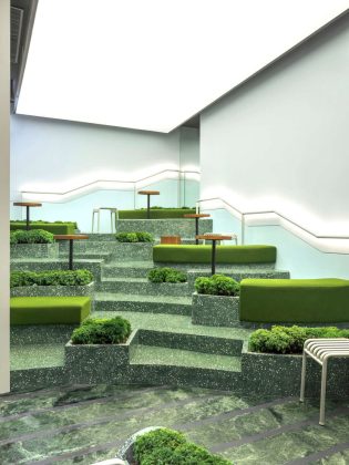 Se da un lato l’Heytea rappresenta il luogo perfetto per il take away, oggi più che mai attuale in tempo di pandemia, dall’altro in fase progettuale è stato pensato con una duplice valenza e quindi anche come luogo per una pausa piacevole e rilassante dove ritrovare la propria dimensione ideale. Qualche seduta in ferro bianco e in legno circondata da grandi fioriere verdeggianti disposta  in fondo al locale  delimita una zona degustazione sobria e accogliente e anticipa un percorso del tutto invitante per chi volesse “risalire” lungo una piantagione di tè in montagna. Ripensata e rivisitata in forma contemporanea, l’idea di questo spazio verde si traduce nella realizzazione di una serie di gradinate irregolari allestite e corredate di fioriere, morbide sedute in tessuto verde brillante e qualche tavolino in legno e metallo. Uno spazio molto particolare, una sorta di giardino contemporaneo dove ci si può concedere un break dallo stress quotidiano per ritrovare un proprio equilibrio in un'atmosfera di quieta contemplazione.