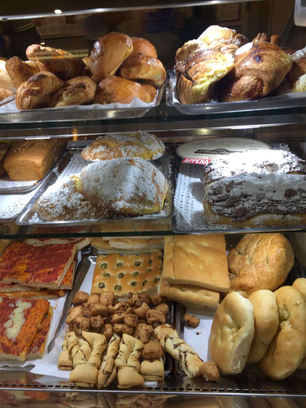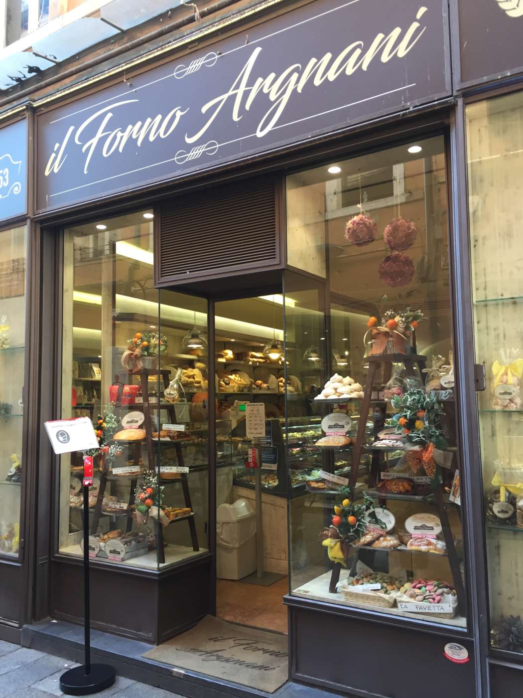 Forno Argnani ha due punti vendita in città. Noi siamo entrati in quello accanto alla sede del Comune, in pieno centro. Abbiamo fatto una coda di una decina di minuti, attirati sia, appunto, dalla coda (ci sarà un motivo se i locali si sottopongono a una lunga fila, no?), sia dalla vetrina in cui fanno bella mostra di sé i dolci da forno della casa, tutti abbastanza semplici, dal fascino casalingo e, come promettono i cartelli, appena sfornati. Tra le specialità: ciambella romagnola, ciambella di ricotta, torta di mele, crostata della zia, torta di riso, amor polenta, torte con yogurt e frutta. E poi i biscotti: scroccadenti di Ravenna (che nell’aspetto ricordano i cantucci), frollini, fave di pasta di mandorle, meringhe. L’interno è piuttosto piccolo e quasi completamente dedicato alla vendita al minuto, anche se ci sono un paio di tavolini. L’ambiente, però, non invita alla sosta, visto il viavai di clienti. Il banco del pane è affiancato da quello della pasticceria dolce e salata. C’è una buona selezione di brioche e lievitati per la colazione, focacce e pizzette. Sul lato corto, è esposta la biscotteria. Forno Pasticceria Argnani, Via Cairoli 1 - Ravenna