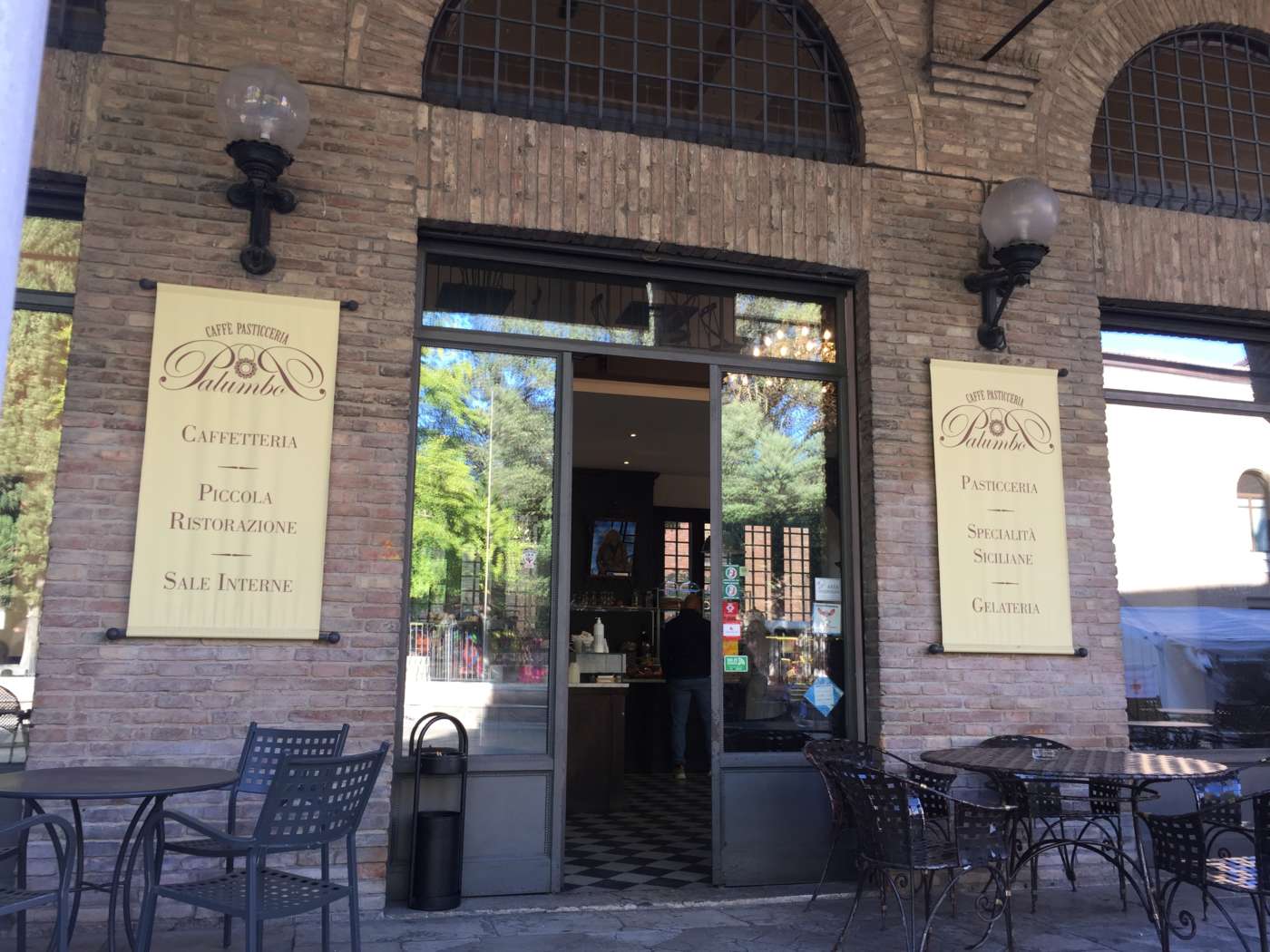 Locale storico nella piazzetta della chiesa di San Francesco, presso cui si trova la tomba di Dante, una delle mete turistiche d’obbligo della città. I tavolini sotto i portici, le due sale interne e i tavoli nel soppalco del Caffè Pasticceria Palumbo invitano ad accomodarsi. L’ambiente è semplice ed elegante. La sala d’ingresso, a doppia altezza e luminosa, è dominata da un grande lampadario e dal bancone a L. Il banco vetrina dedicato alla pasticceria è piuttosto piccolo. In esposizione vediamo 20 tipi tipi di mignon, oltre a sfogliatelle e babà, bigné ed éclairs, oltre a 4-5 crostate e a una cassata già porzionate a fette. Si ha l’impressione che le torte siano destinate più al consumo all’interno del locale che all’asporto, e che la pasticceria sia pensata per differenziarsi nel panorama cittadino. Un ripiano è dedicato al salato: qualche toast e tramezzini, un paio di panini e qualche panino mignon. Brioche e lievitati sono invece vicini al banco della caffetteria. La lavagna con l’elenco dei vini al bicchiere e la nutrita bottigliera sembrano indicare che qui l’aperitivo ha un ruolo importante, mentre il banco dei gelati - non funzionante al momento della nostra visita - contiene una dozzina di carapine. Due addette rapide, attente ed efficienti hanno garantito un ottimo servizio. Caffè Pasticceria Palumbo, piazza San Francesco 3 - Ravenna
