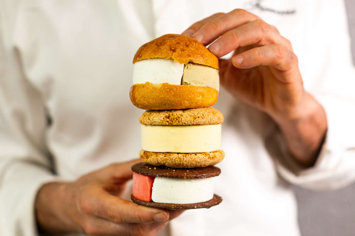 A differenziare la gamma di Diametro 7 è la natura del disco che contiene il gelato: biscotto frolla, biscotto savoiardo e brioche. Ferrara attinge alla sua formazione in pasticceria per le tre versioni di Diametro 7. La frolla è una sabbiata al cacao, studiata per mantenere croccantezza e resistere all’umidità del gelato dedicata a chi preferisce il crunchy. Il savoiardo dall’impasto classico, viene sottoposto a doppia cottura per una maggiore friabilità, per la nota “sbriciolabile”. La brioche con lievito madre è aromatizzata con zeste di limone e arancia e vaniglia di Tahiti per un morso morbido. A completare Diametro 7 il gelato “ready to eat” di Fomaessenza inserito all’interno con due semilune di duplice gusto. Disponibile anche in mezza porzione con singolo gusto.