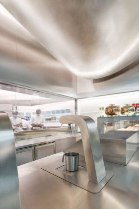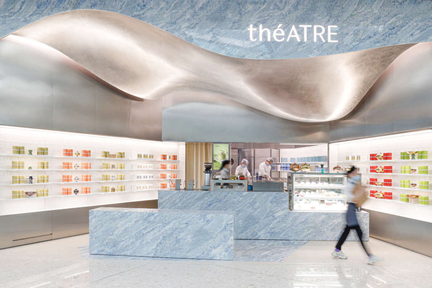 Shanghai (Cina). In un grande centro commerciale della città, il ThéATRE tea shop è un luogo in cui un’antichissima attività cerimoniale è stata reinterpretata con una visione architettonica innovativa. Un piccolo spazio, solo 50 mq, completamente aperto al pubblico come fosse un palcoscenico teatrale dove mettere in scena lo spettacolo della vendita e preparazione di torte, pasticcini e prodotti alimentari fortemente legati al tè e a tutto l’immaginario che si muove intorno ad esso. La forma sinuosa e dinamica del soffitto curvo, fatto a mano da artigiani locali piegando fogli di acciaio in un pezzo unico, trae appunto la sua ispirazione dal movimento delle gocce d’acqua nel momento in cui diventano tè puro. Così, sotto questa grande onda argentea in movimento verso l’interno della facciata, prende forma uno spazio etereo, fatto di riflessi di materiali, colori e luci. L’interno è caratterizzato da linee semplici e pochi elementi architettonici: un layout essenziale, giocato sull’accostamento di differenti materiali con tonalità e texture differenti, il marmo per i banconi al centro, la piastrella lucida per la pavimentazione e l’acciaio per il soffitto e parte del rivestimento delle pareti. «Il progetto - precisano i due architetti Marcella Campa e Stefano Avesani - offre alcuni elementi interessanti nel prospetto verticale, dove sono rintracciabili tre diversi livelli progettuali». Il primo è quello riguardante il soffitto scultoreo, che abbraccia l’intero volume spaziale e ne diventa il principale elemento architettonico. Il secondo è quello caratterizzato da un design minimal ed è dedicato a ciò che il negozio ha da offrire ai suoi clienti. Una grande vetrata sul fondo mette in mostra il processo di preparazione delle torte all’interno di un laboratorio a vista. «L’idea era quella di esprimere pulizia, efficienza e attenzione ai dettagli. Abbiamo cercato infatti di esprimere questa attenzione alla precisione, all’innovazione e alla ricerca progettando la cucina a vista come un laboratorio estremamente pulito e rigorosamente bianco. Abbiamo impiegato quindi materiali come l’acciaio inossidabile spazzolato e le piastrelle di ceramica bianca lucida caratterizzate da morbidi motivi a diamante che fanno riverberare la luce sulla loro superficie».