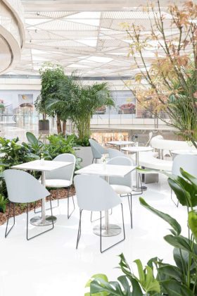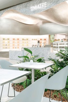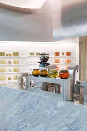 Il terzo livello è quello dedicato all’esperienza e all’interazione con i clienti. Anche qui è riproposto il medesimo accostamento cromatico tra acciaio e superfici bianche, con l’aggiunta materica del marmo e di una pavimentazione in piastrelle lucide. Al centro due grandi “scatole” in marmo massiccio, di cui una attrezzata con una serie di erogatori per la preparazione del tè e una vetrina espositiva in vetro trasparente per l’esposizione dei dolci in vendita, organizzano le funzioni del servizio di vendita. Il marmo locale dream blue, qui utilizzato, ha una porosità granulare tipica dello zucchero e cambia leggermente il suo colore secondo l’intensità della luce. Lo stesso marmo è stato selezionato anche per definire il cancello d’ingresso sopra la facciata del negozio, la cui forma è la proiezione diretta della sezione di taglio sul soffitto curvo e originariamente doveva assomigliare alla forma del paesaggio delle colline del tè. Lungo le pareti laterali, a spezzare la continuità del rivestimento in acciaio a tutta altezza, sono stati realizzati degli espositori semplici e luminosi, fatti di piastrelle di ceramica lucida, dove esporre ordinatamente alcuni dei prodotti in vendita. Il ThéATRE ha una sua piccola appendice in un patio esterno, uno spazio che si ispira all’idea delle colline di tè, circondato da grandi vasi in cemento contenenti piante verdeggianti e arredato in parte con una serie di panchine curve e morbide e in parte da una serie di tavoli di marmo e comode sedute in una totalità azzurro pastello.