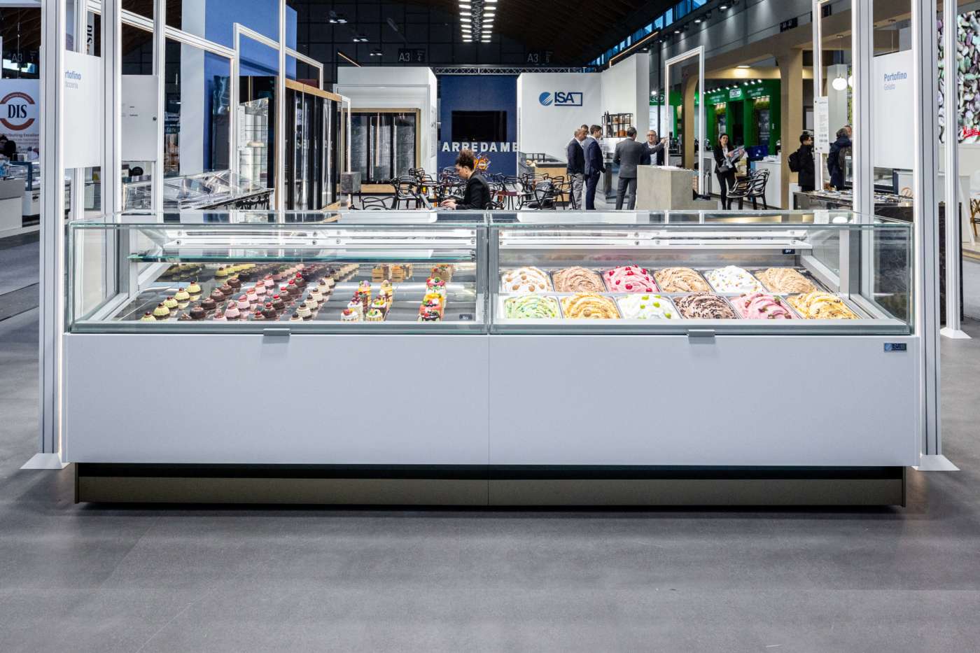 La nuova vetrina professionale Portofino si distingue per l’innovativo design dei vetri che enfatizza la visibilità dei prodotti esposti. Esalta la visibilità del gelato, grazie alla posizione rialzata delle vaschette quasi a livello del piano espositivo e all’illuminazione interna a Led a luce continua ed uniforme. Per il modello pasticceria sono presenti, invece, mensole in vetro con profondità di 240mm illuminate da Led. Inoltre, la vetrina Portofino è dotata un sistema di apertura vetri frontale servoassistita verso l’alto brevettato da Isa per facilitare al massimo le operazioni di pulizia quotidiana.