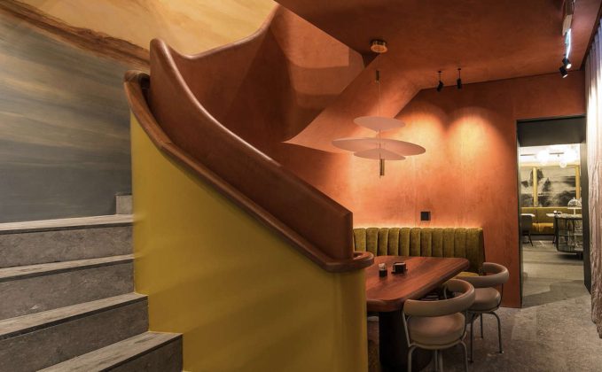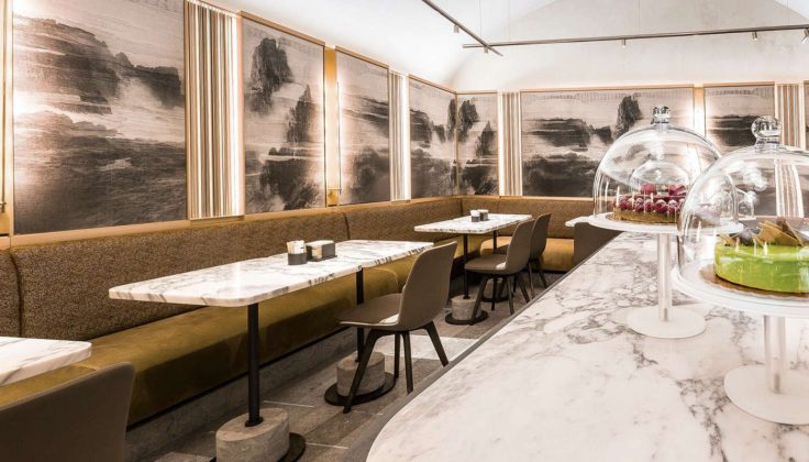 Nella seconda saletta, pure questa oggi più luminosa, la ristrutturazione ha fatto sparire elementi di servizio come la vetrina refrigerata e il banco per il buffet. Tutto lo spazio è così dedicato a tavolini e sedute in toni pastello. La tromba delle scale, prima un anonimo passaggio tra le salette sul fronte e la sala da tè sul retro, oggi è un ambiente caldo e avvolgente, con la scenografica scala-scultura affrescata che cattura l’occhio. Il sottoscala è stato valorizzato e oggi vi trova posto un accogliente tavolo in legno abbracciato da divanetti e poltroncine imbottite. Anche la sala da tè (annessa al locale nel 1994) ha cambiato arredi ed evoca le atmosfere dei caffè viennesi, con tavolini in marmo, pareti rivestite da raffinati pannelli decorativi in stile cinese e una tavolozza di colori giocata sui grigi e su tonalità naturali più spente. Il fil rouge di tutti gli interventi è la preziosità dei materiali usati, molti dei quali di provenienza locale e lavorati da artigiani del territorio, come nel caso del marmo verde delle Alpi per il banco bar. Troviamo poi pavimenti in petit granit, pietra di Sarnico, breccia di Stazzema per i tavolini, corrimani in mogano, arredi in cedro, carta da parati a pergamena decorata a mano e con motivi floreali in rilievo. Tutti dettagli che contribuiscono a creare un ambiente all’altezza della qualità della proposta. Proposta che, da parte sua, non è cambiata: dal laboratorio artigianale della famiglia Cerea continuano a uscire classici come la torta Donizetti o la torta Cavour, accanto a brioches, biscotti, pasticcini, mignon e dolci al cucchiaio. Inoltre, c’è un menu per il pranzo leggero e, la domenica, il tradizionale gran buffet.