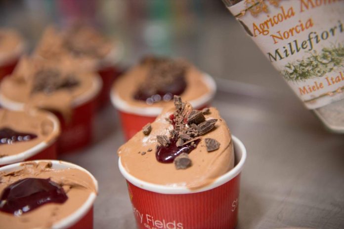 È sempre il giorno del gelato da Strawberry Fields, ma lo scorso 24 marzo lo è stato un po’ di più. In occasione del Gelato Day, la festa indetta dal Parlamento Europeo nel 2013 e promossa da Artglace – la Confederazione delle Associazioni dei Gelatieri Artigiani d’Europa – nella gelateria di Colli Aniene, alla periferia Sud di Roma, Geppy Sferra ha giocato con i suoi ospiti a preparare la Torta Foresta Nera in versione da cono e coppetta. La tradizionale Schwarzwald Kuchen, la torta tedesca più famosa, era infatti il tema scelto da Artglace per il 2018 e il gelatiere romano l’ha rielaborata riportandola all’essenziale, ovvero eliminando la panna e concentrandosi sul confronto tra cioccolato e amarene, arricchite dalla consistenza croccante delle fave di cacao sbriciolate a crudo. Ecco dunque un classico e cremoso gelato al cioccolato, rinforzato con una nota di liquore al kirsch, poi variegato all’amarena e infine guarnito con la granella di semi di cacao. E il cacao non è un cacao qualsiasi, ma il Nacional Arriba Fino de Aroma, un monorigine dell’Ecuador considerato tra i migliori al mondo, e ricercato da Sferra fra le coltivazioni eque e solidali nel sud del mondo. L’etica e la cultura sono infatti alla base del lavoro che giornalmente compie Geppy Sferra attraverso le sue due gelaterie, collocate entrambe in periferia e in quartieri commercialmente difficili, come Tor de’ Schiavi, dove ha aperto la sua prima sede nel 2011, e Colli Aniene, dove si trova il laboratorio più grande, in cui Sferra fa anche corsi di gelato.