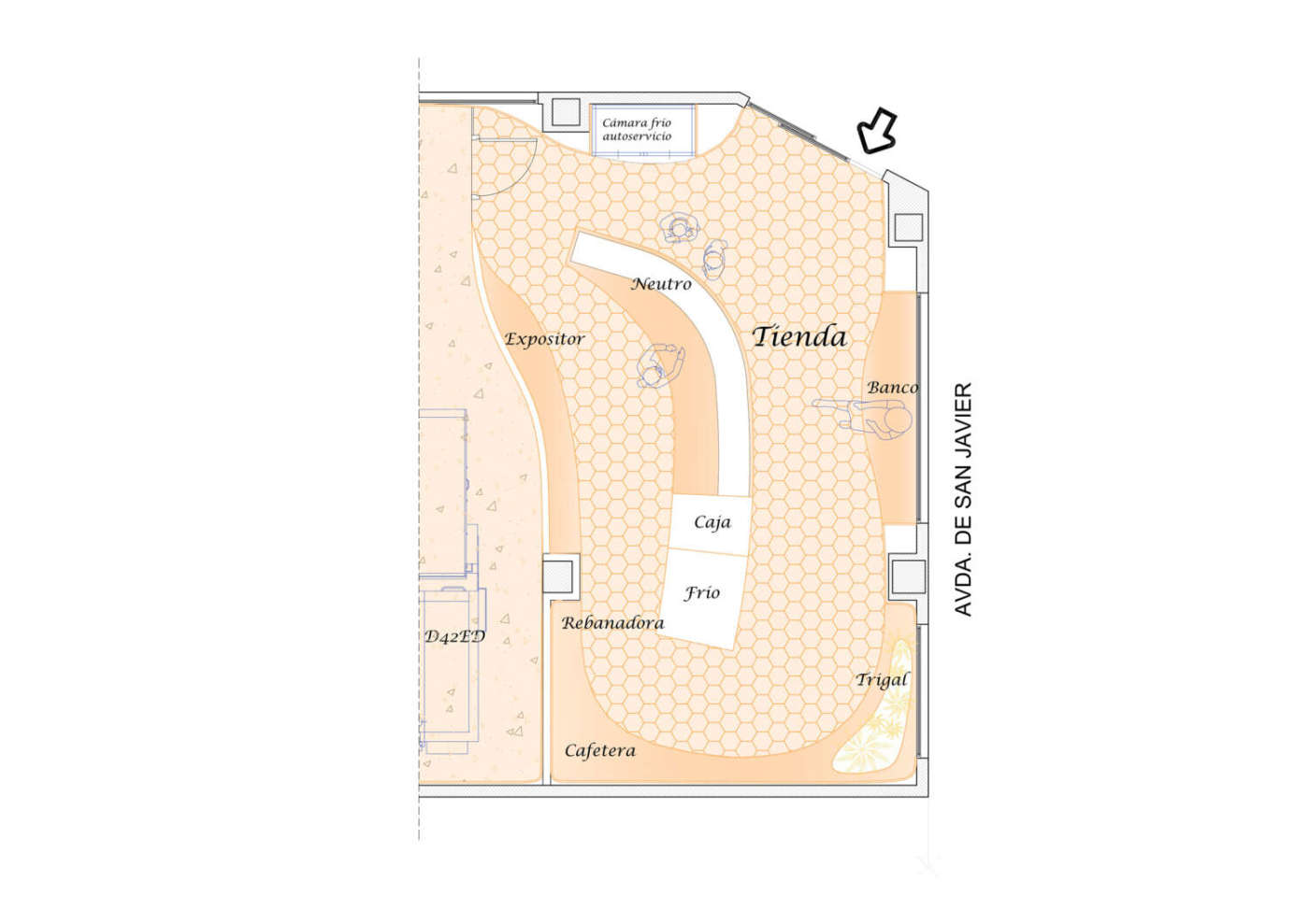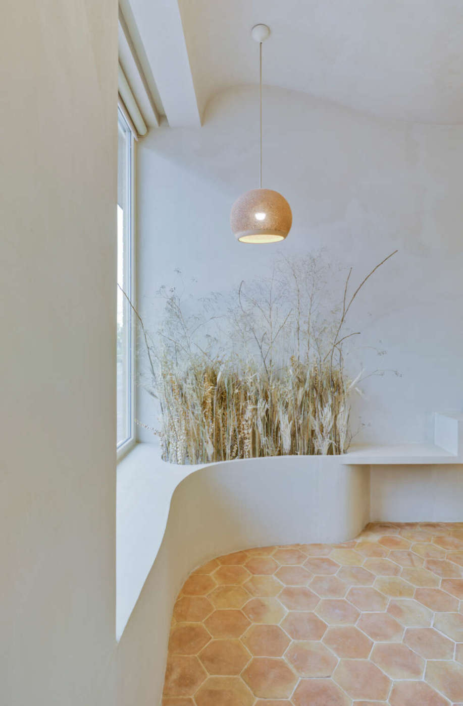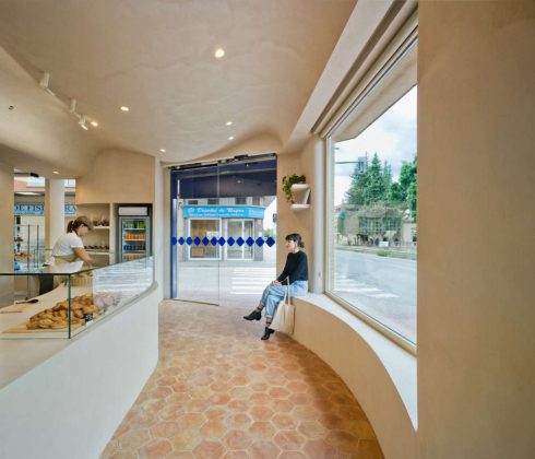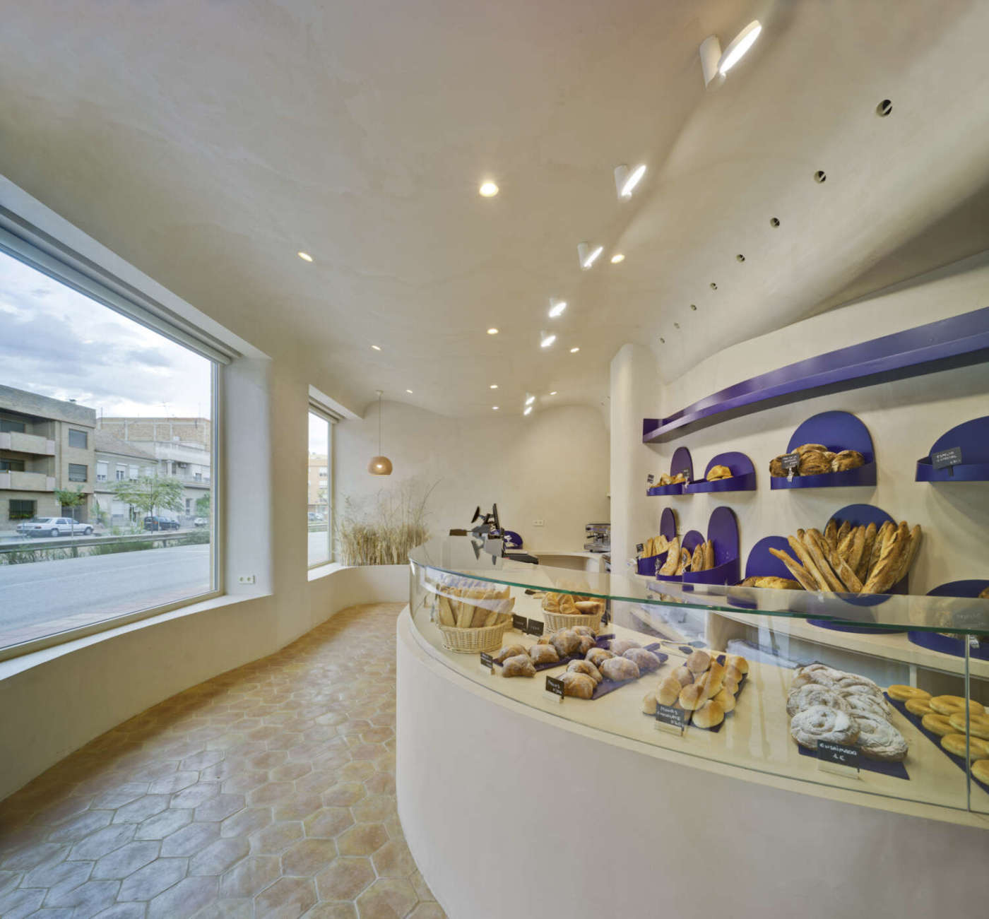 Murcia (Spagna). Fuggire dall’estetica romantica delle boulangerie francesi per ritrovarsi tra fasci di spighe, scappare dal rigido design di stampo industriale per lasciarsi conquistare da morbide pareti bianche e blu. Nella spagnola Beniaján, vicino a Murcia, La Madrugada è un forno-pasticceria che trova una sua identità unica e nuova, dove tutto parla di artigianato, di manualità e di tradizioni, senza volersi mai rifare a un’estetica già vista. Progettata da Laura Ortín Arquitectura, il locale si apre su strada con tre ampie vetrine di cui una d’ingresso ed è quindi inondata dalla luce naturale. «La progettazione è pensata come uno svuotamento - , spiega la Ortín -. Soffitti, pareti e mobili sono un continuum curvilineo che dà vita una spazialità onirica, qualcosa di surreale che fa sì che il negozio ti avvolga a 360º con la sua morbidezza, producendo calma e benessere». Il soffitto, infatti, ha una controsoffittatura a onde e le pareti sono state trattate per riprendere lo stesso effetto. Minimale nelle forme e negli arredi, La Madrugada non prevede tavoli e sedie ma solo panche ricavate dalla muratura che corrono sotto le grandi vetrate e lungo una parete. Sullo sfondo, un angolo si trasforma in un “campo di grano”, illuminato, come un piccolo angolo a se stante, da una poetica lampada di argilla. Dall’ingresso, il lungo bancone è il tema centrale del locale, di cui occupa gran parte dello spazio disponibile: il flusso della clientela procede così sviluppandosi lungo il bancone senza incontrare ostacoli.