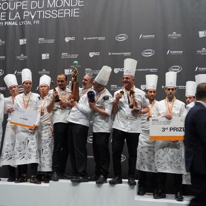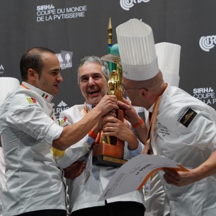 Il team composto da Lorenzo Puca, Massimo Pica e Andrea Restuccia alza la coppa in un tripudio di gioia, assieme al maestro Alessandro Dalmasso, presidente del Club della Coupe du Monde de la Pâtisserie Selezione Italia e coordinatore dei duri allenamenti che i nostri tre pasticceri hanno affrontato per mesi, per prepararsi alla sfida.