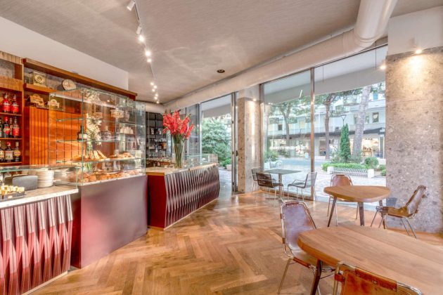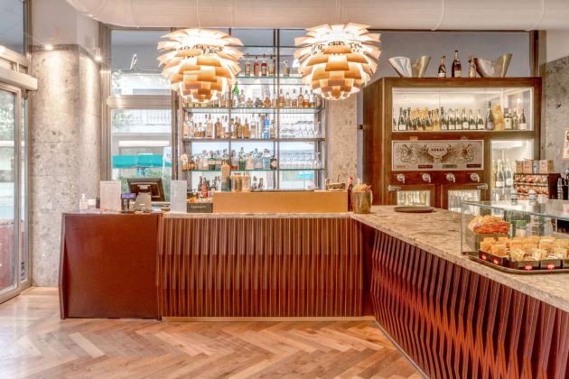 Il contatto diretto con l’intorno urbano e i suoi pini marittimi è uno dei tanti punti di forza su cui ha puntato il restyling messo in atto dallo studio Giovanni Mecozzi Architetti. Il progetto d’interior design unisce elementi dal design classico ad arredi di recupero e a materiali naturali, come legno e pietra a grande pezzatura. L’ampio bancone dal frontale particolare, per dimensioni ed estetica, è il trait d’union fra quanto è stato mantenuto del locale originario e i nuovi inserimenti. Il piano terra è impostato sulla stretta connessione tra l’interno e il grande dehors, in virtù del perimetro completamente vetrato che consente un ampliamento percettivo dello spazio interno verso l’ambiente esterno. La conformazione degli elementi di arredo e delle soluzioni a parete consentono una funzionale suddivisione dei flussi tra le varie zone su due piani: caffetteria, gelateria e area per i cocktails serali, identificata dai due lampadari di design. L’ampia zona consumazione nel dehors del piano terra trova corrispondenza con quella al primo piano, che si proietta sulle chiome dei pini marittimi, elementi caratteristici della storia e del paesaggio naturale della cittadina romagnola.