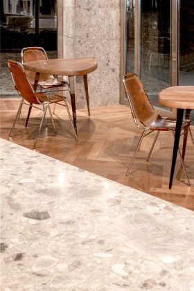 È l’elemento identificativo del locale e al tempo stesso la guida dei flussi interni e della suddivisione delle tre macro aree del piano terra, anche se dimensionalmente modesto. Il bancone, con il suo segno continuo, distingue in maniera naturale l’area destinata alla caffetteria da quella laterale destinata alla gelateria, individuando alle due estremità gli ambiti cassa e la distribuzione interna, con la scala per accedere al primo piano. Il frontale del banco è realizzato attraverso l’accostamento di listelli di legno, intervallati da una lamina di rame, dal differente andamento per creare un movimento ritmico verticale e rapportarsi alle lavorazioni superficiali degli arredi in legno retrostanti. L’accostamento cromatico e materico fra rame e Ceppo di Grè ne fa risaltare le peculiarità. È la stessa pietra dei rivestimenti murari, che per il piano del bancone è posata in due lastre posate a secco non stuccate.