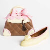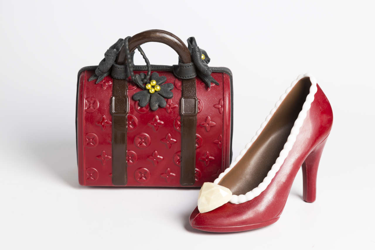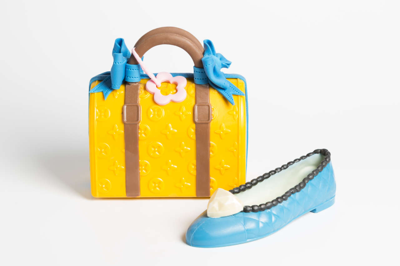 La creatività prosegue con un ammiccamento all'alta moda: la Fashion Egg Bag, a forma di uovo e decorata con rombi e fiorellini in cioccolato. E poi borse e scarpe, tutte completamente in cioccolato decorato con pasta di zucchero e ghiaccia reale. Décolleté, ballerine e tacco 12 accanto a bauletti trapuntati o borse dal manico in bambù.