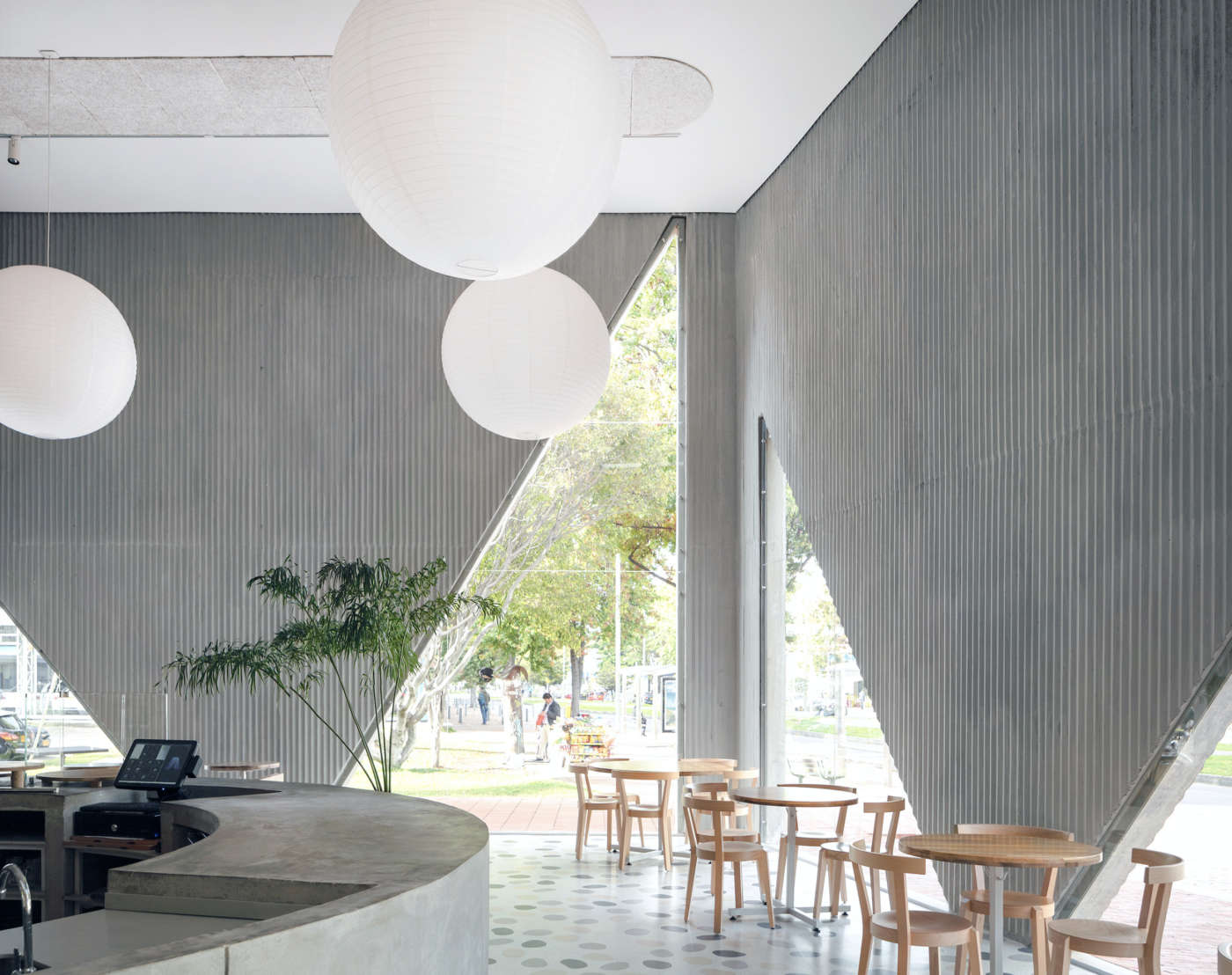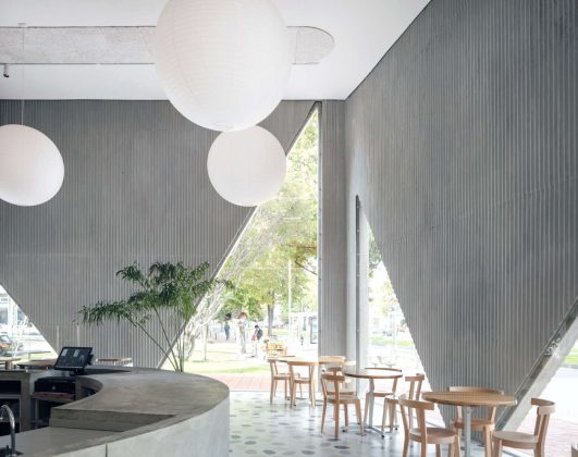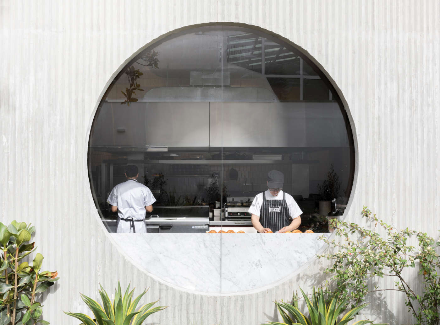 Non le solite finestre, ma aperture triangolari di diverse dimensioni sono il segno distintivo di un locale multitasking nella periferia Nord di Bogotà, in Colombia. Masa è la caffetteria, panificio, ristorante, nonché spazio commerciale e patio all’aperto delle sorelle Silvana e Mariana Villega, in uno dei quartieri residenziali benestanti della capitale colombiana. È questo il secondo avamposto - e il più grande - che lo Studio Cadena ha progettato per il marchio nella capitale colombiana (il primo è un piccolo caffè aperto nel 2014). I prospetti, una composizione scalare di volumi e di tagli vetrati che di notte riflettano una luce calda, sono impostati per essere un forte richiamo già dalla strada. Le finestre triangolari che dominano l’affaccio della caffetteria, infatti, rivelano quanto sia accogliente l’interno, da cui ammirare i dintorni durante le varie pause food che scandiscono la giornata, come espressamente richiesto dalla committenza.