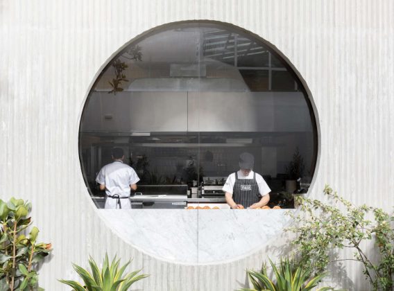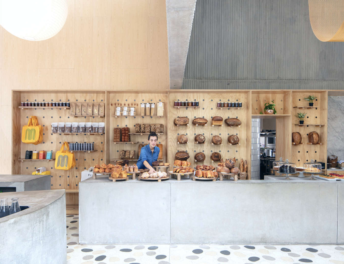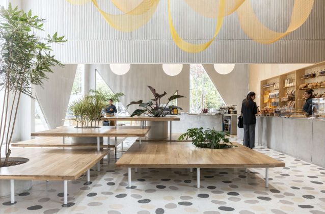 L’involucro dal forte carattere contemporaneo racchiude spazi interni luminosi e ampi, caratterizzati da elementi ambientali di grande effetto: illuminazione scenografica, pavimento unico realizzato con grandi piastrelle di terrazzo fuse a mano incorporate nel seminato tradizionale, pareti in cemento armato gettato in opera e nastri di rete metallica color terra di Siena che scendono come drappi dal soffitto. Ad aumentare l’impatto dell’ambientazione interna, che vive in stretta relazione con l’esterno, concorrono le aperture circolari (in sostanza dei passavivande), gli specchi collocati in posizioni strategiche, l’ampio utilizzo del legno chiaro (boiserie a tutt’altezza, scaffalature, panche, tavoli e sedute) e le grandi porte scorrevoli. Il design definisce volumi spaziali distinti, ma consente di spostarsi attraverso di essi con la libertà di un open space. Seppur le dimensioni (700 mq) siano notevoli, non si percepisce la sensazione di vuoto che facilmente suscitano ambienti simili. Il lungo bancone per la vendita dei prodotti da forno e la postazione circolare della caffetteria, entrambi in cemento faccia a vista, sono posizionati all’ingresso insieme a una piattaforma a più livelli per la seduta, con l’intento di interrompere il flusso spaziale in orizzontale. Gli scultorei sistemi d’illuminazione distinguono i diversi volumi: grandi globi di carta illuminano il caffè all’angolo, mentre la rete metallica dipinta a mano che è appesa al soffitto cattura la luce naturale nel volume centrale. Come detto, il progetto si basa sulla stretta connessione fra interno ed esterno: ne sono chiaro esempio i lunghi tavoli comuni in legno, che presentano grandi ritagli circolari per piante e alberi, l’abbondanza di luce naturale e la grande finestra della cucina che si affaccia sul giardino.