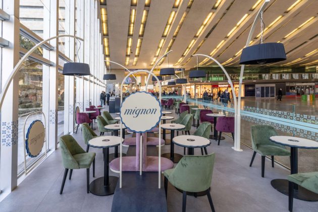 È uno spazio nello spazio, che dialoga con le architetture circostanti in modo fluido e senza soluzione di continuità e che si inserisce in perfetta armonia con la vetrata retrostante. Il grande bancone, dalle dimensioni decisamente importanti, si snoda secondo un andamento a S, con tre grandi vetrine a vista ed è ben definito da alcuni elementi distintivi come il legno, declinato in un colore blu desaturato che riprende il brand Mignon. «La matericità delle geometrie - spiegano i progettisti - è sottolineata ma al contempo “alleggerita” con fughe e dettagli in metallo laccato che sottolineano la fluidità del segno architettonico. Le sovrastrutture metalliche in arredo che si declinano in lampade, mensole ed alzate portalampade, reinterpretano le forme ad arco presenti sui lati esterni della stazione riproponendone la serialità modularmente, ma decostruendone la forma».