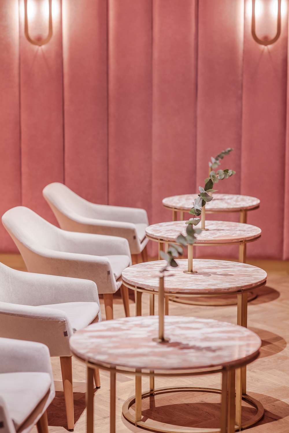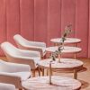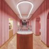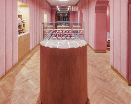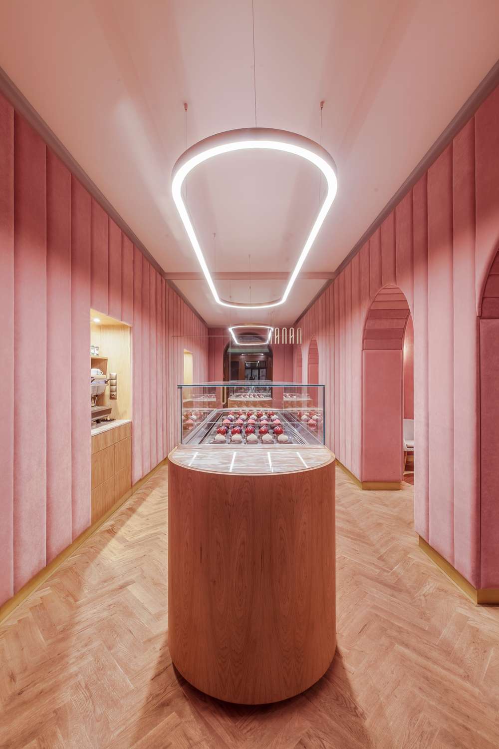 Nanan in francese significa prelibatezza. A Breslavia è il nome di una piccola pasticceria che rievoca le atmosfere delle patisserie francesi. Poco meno di 100 mq trasformati dai creativi di Buckstudio specializzati nel settore dell’ospitalità e dell’architettura di interni nel settore retail: un progetto di interior design a 360°, che ha coinvolto totalmente anche il branding, dal disegno del logo al menu, dalle confezioni alle uniformi del personale, sino alla configurazione della cucina e degli utensili. Ad ispirare i giovani architetti polacchi la specialità proposta all’interno della pasticceria, i noti “eclair” lunghi e sottili dolci di pasta choux riempiti e glassati. I riferimenti al noto pasticcino francese sono ovunque, dal disegno delle lampade agli specchi, dalle maniglie delle porte agli appendiabiti sino al grande bancone ovale a isola dove sono esposti in vetrina, come fossero veri gioielli, i prelibati dolcetti. Due sono gli ambienti adibiti al pubblico, delimitati da 3 grandi archi che separano la zona del bancone da quella dedicata alla degustazione, arredata con raffinata essenzialità con eleganti poltroncine e tavolini rotondi. Scenograficamente il colore scelto per gli interni è il rosa, nella tonalità “millennial pink”: grandi pannelli in morbido velluto per rivestire le pareti e una tonalità più chiara per la tinteggiatura dei soffitti, alternati al bianco delle sedute, all’ottone e al marmo dei tavolini e al legno del bancone e della pavimentazione.