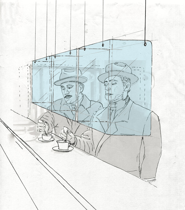- Distanziatore flessibile Adatto nei locali di una certa dimensione in cui diventa più difficile la gestione dei flussi all’entrata, soprattutto se il locale non dispone di un’uscita separata, e l’accesso ai servizi igienici si trovano al termine di un lungo corridoio. L’arch. Daniele Lauria - Studio Lauria propone una soluzione semplice, flessibile e, in una certa misura utilizzabili per altre funzioni finita l’emergenza sanitaria realizzabile tramite un pannello modulare appeso a soffitto oppure una scaffalatura leggera (metallo, legno, metacrilato) su ruote che può diventare multifunzionale: partizione verde, libreria, griglia per piante aromatiche oppure sistema espositivo per le confezioni.