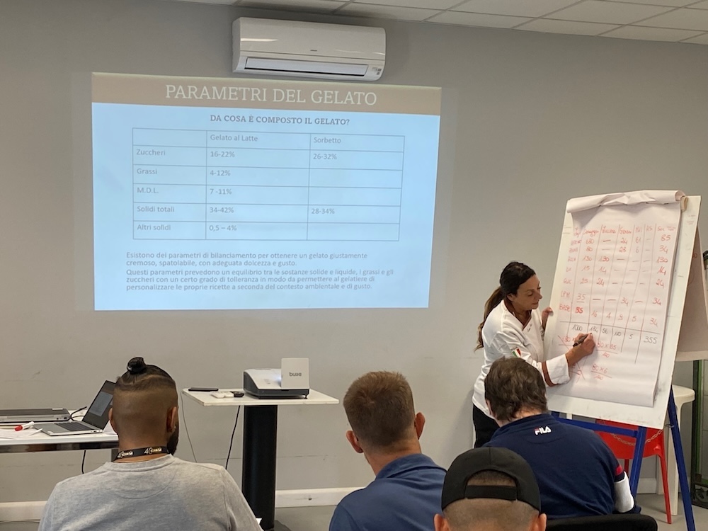 Come quello precedente, anche il secondo corso di gelateria base tenuto da Cristina Ricci si è concentrato sul dietro le quinte della gelateria. Si è parlato del lavoro del gelatiere artigianale, di cosa serve in un punto vendita e, naturalmente, di come si produce il gelato. Nella due giorni, dopo la teoria si è passati alla pratica individuale. I corsisti, infatti, hanno realizzato diversi gusti di gelato dedicandosi anche alla presentazione e alla decorazione delle vaschette.