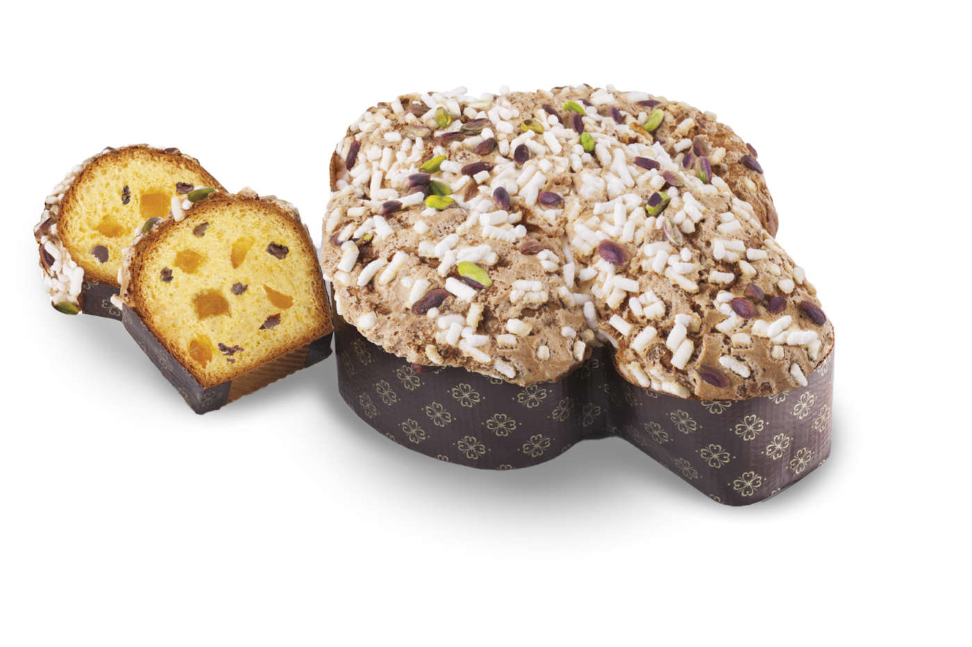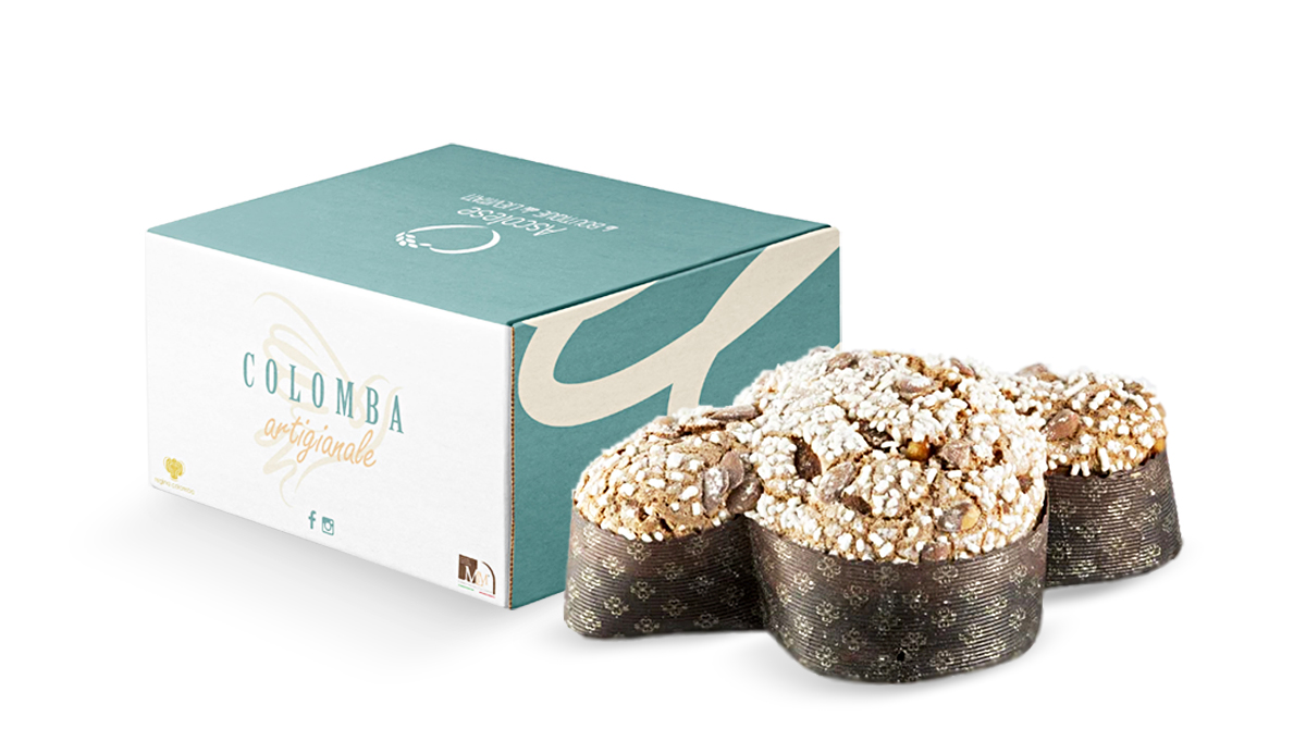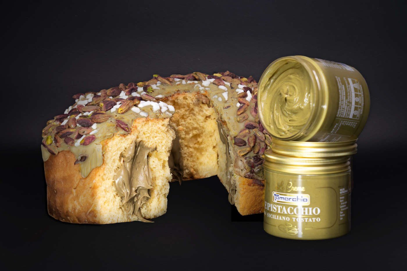 La colomba al pistacchio con crema spalmabile di TomarchioTomarchio Pasticceria Siciliana celebra la Pasqua con le sue colombe. L'impasto morbido, fragrante e alveolato è sottoposto a una lievitazione lenta che supera le 30 ore. Protagonisti: la mandorla e il pistacchio, quest'ultimo presente sia in copertura che in versione spalmabile in vasetto. Oltre alla versione classica con canditi, il brand propone quella senza canditi, la colomba ricoperta di cioccolato al pistacchio, pistacchi interi, granella di zucchero con crema al pistacchio, e al cioccolato.