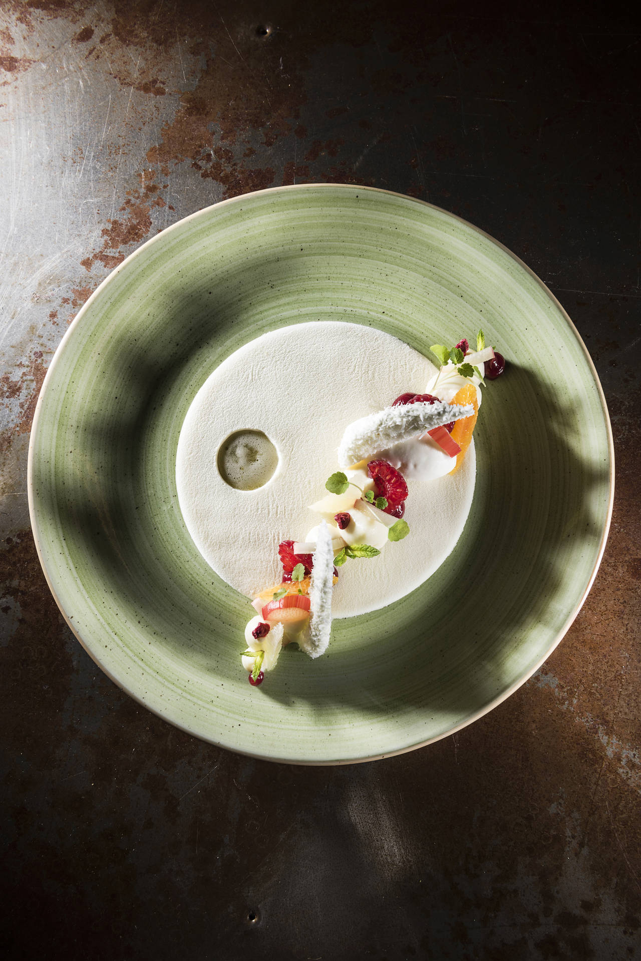 Sulla questa base vengono poste, seguendo una linea ideale che la attraversa, degli spuntoni di ganache al mascarpone e cioccolato bianco, bottoni di crema al lampone e quenelle di gelato allo yogurt. Il dessert è completato da lamponi freschi, e spicchi di arancia e lime pelati a vivo: non semplici guarnizioni o tocchi cromatici, ma elementi che, a ogni cucchiaiata, conferiscono le note acidule che ripuliscono il palato dalla grassezza della gelatina al cocco. Dei pezzetti di rabarbaro cotto nello sciroppo di lamponi danno un’ulteriore nota di sapore, tra fresco, acidulo e leggermente amaro. La freschezza è delegata anche ai germogli di menta e a quelli di atsina, un vegetale il cui sapore che richiama l’anice dolce, la liquirizia e il finocchio. A completare il tutto, la nota croccante: due cialdine di meringa al cocco e lime.