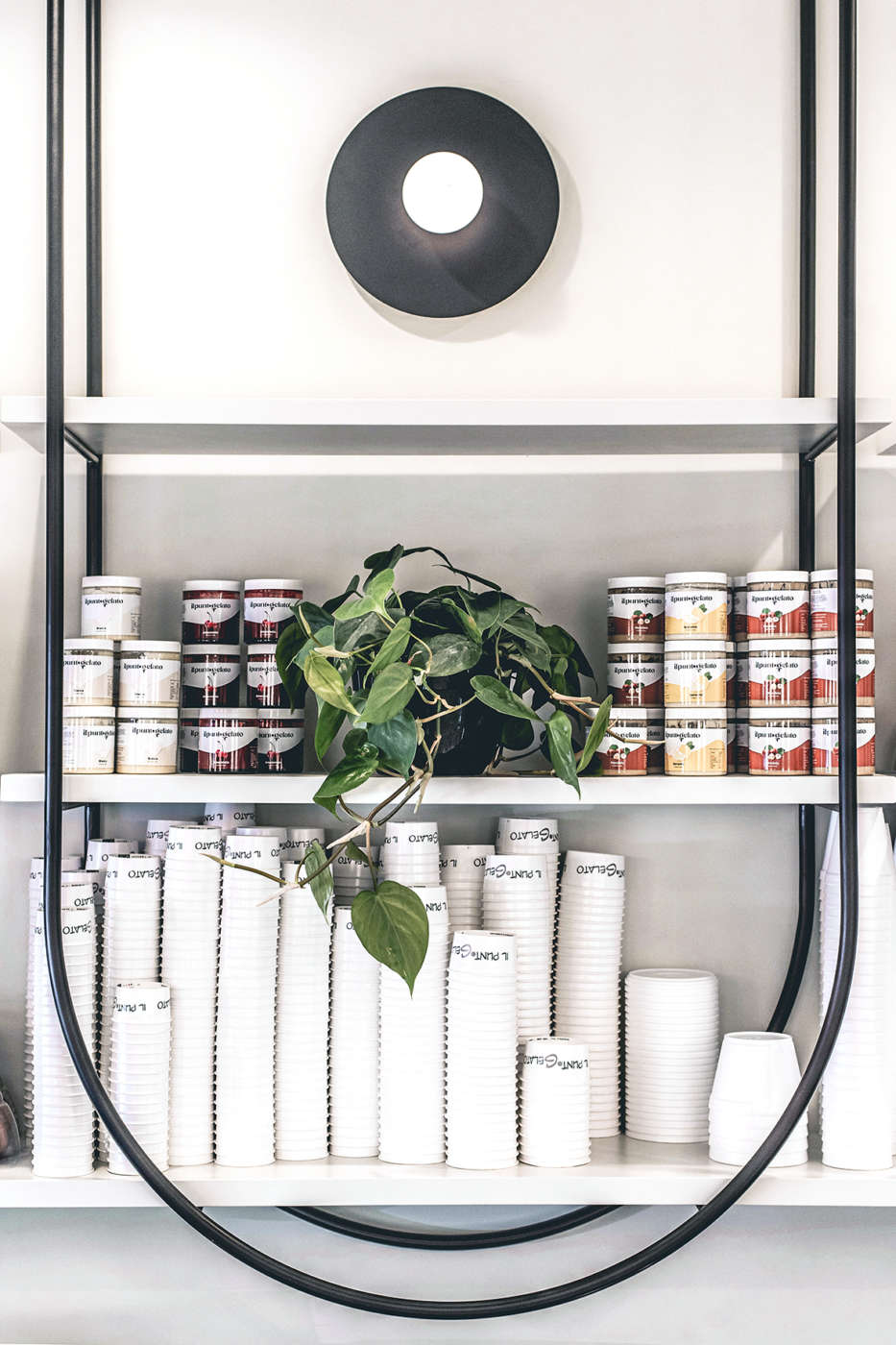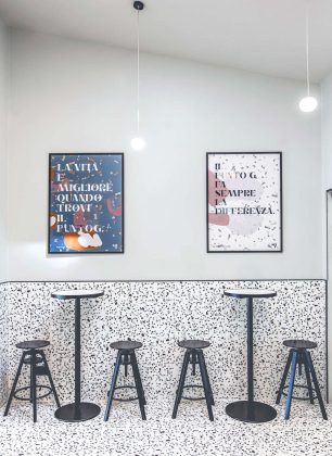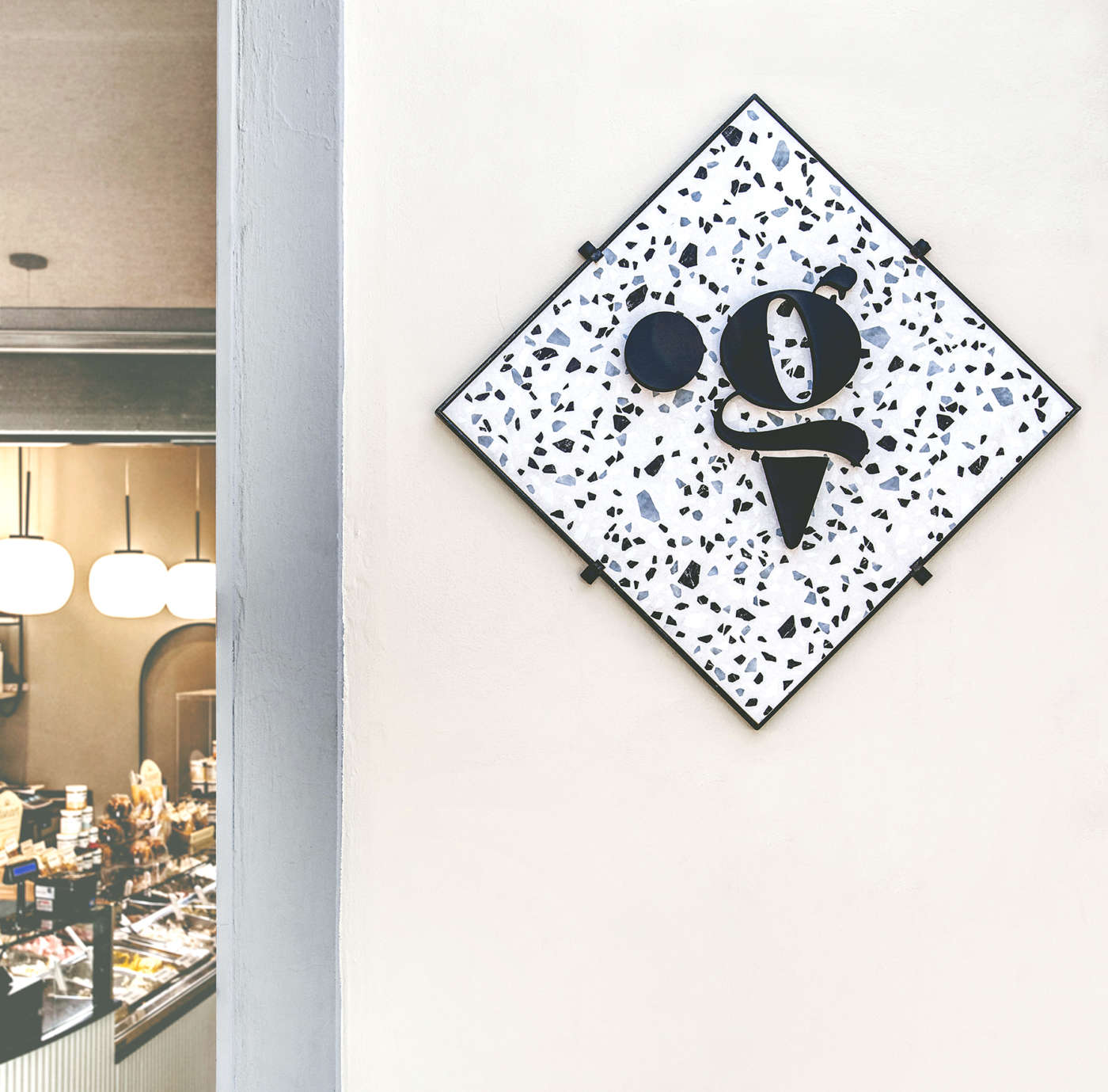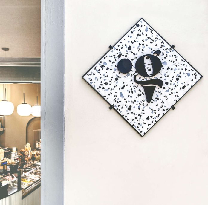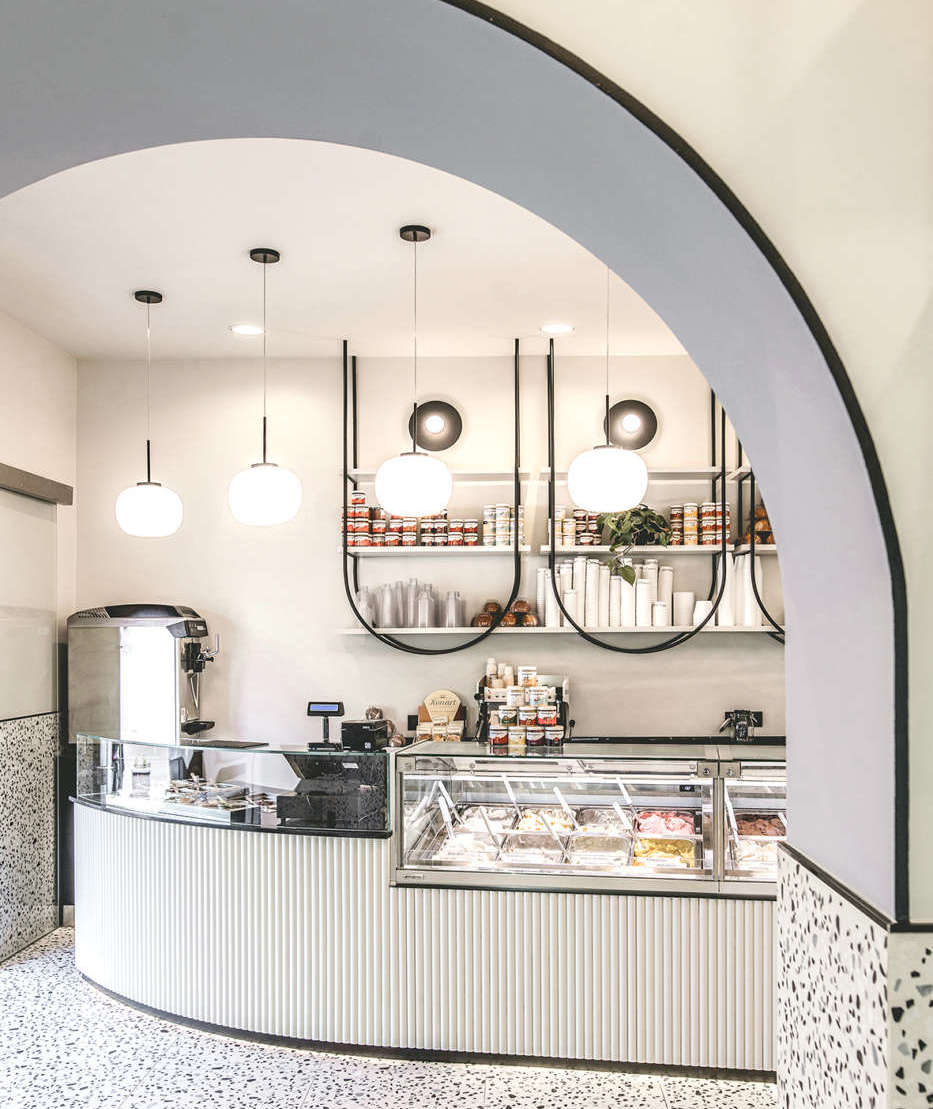 Format Il concept che ha guidato gli architetti durante la fase progettuale sono stati proprio i gelati, a cui si sono ispirati per tutte le linee arrotondate presenti nel pdv e il logo. Luci Sopra il bancone una serie di grandi lampade a sospensione danno risalto alla vetrina dei gelati. Sul soffitto una serie di faretti ad incasso e tre lampade a parete poste tra gli scaffali. Unicum Tre sono gli ambienti: lo shop, l’area dedicata all’esposizione delle torte gelato e una saletta interna dove potersi fermare più a lungo. Superfici In questo negozio, la graniglia scelta nella tonalità del bianco e del nero ricorda infatti l’estetica del gusto stracciatella. Scaffali Dietro al bancone sono stati pensati degli scaffali caratterizzati da una struttura portante ad arco rovesciato in ferro che regge ripiani laccati bianchi. Ingresso Il bancone è stato posizionato secondo andamento obliquo rispetto al fronte strada: non potendo posizionarlo frontalmente rispetto all’ingresso.
