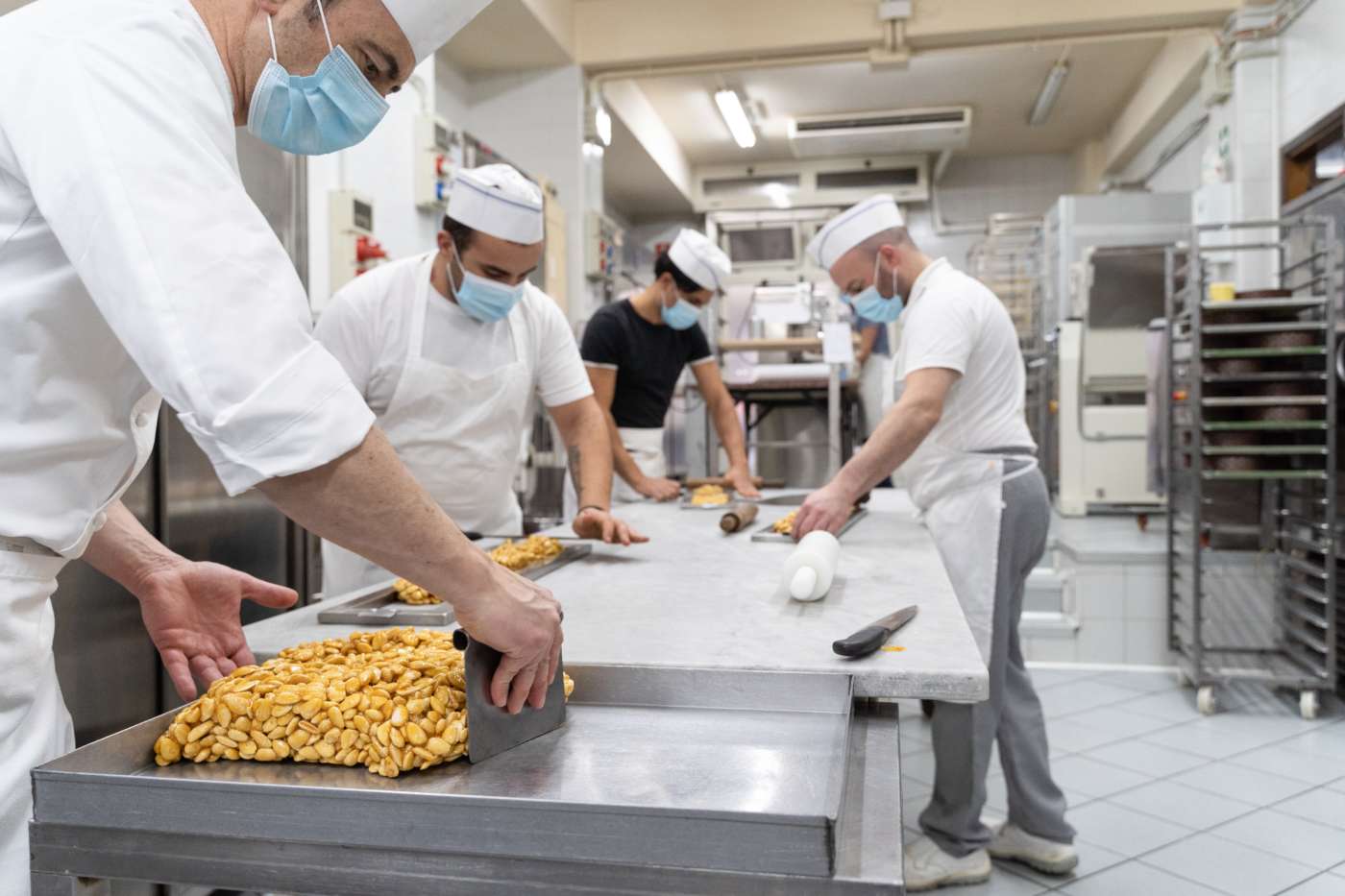 E ancora il miele, che arriva dalla piana di Gioia Tauro, dove ci sono per lo più aranceti. «Qui facciamo riferimento a un apicoltore locale che ci dà un miele d’arancio e fiori di zagara dalla profumazione incredibile». E infine lo zucchero, “quello per il croccante - dice Scutellà - cominciamo a sceglierlo subito dopo Pasqua. Alcuni diventano troppo scuri quando si sale con la temperatura, che arriva a 165°C; ce ne serve uno che restituisca un caramello medio, né biondo né scuro. Quando trovo l’optimum, compro un lotto che mi permetta di coprire tutta la produzione annuale».