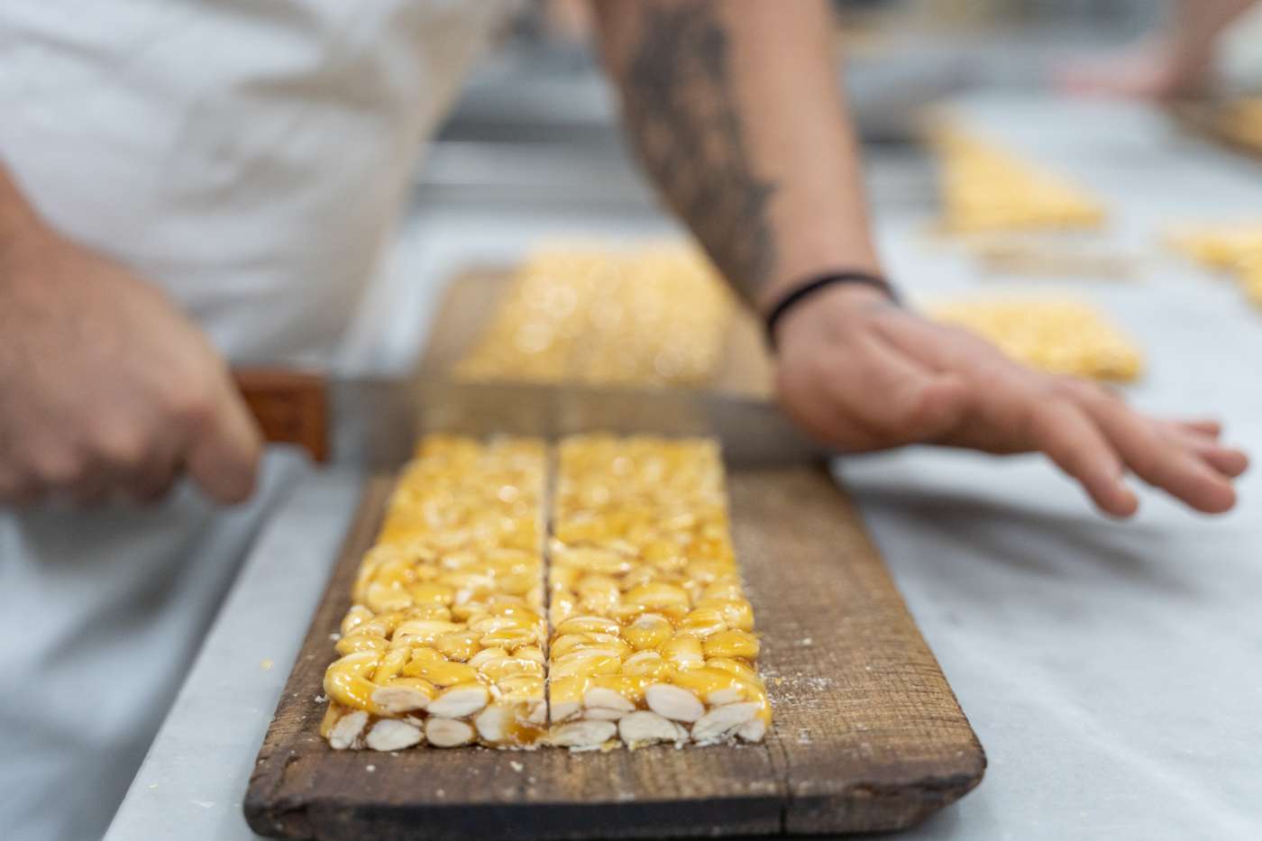 Comincia tutto dalle mandorle, con l’obiettivo di «acquistare il meglio che la natura ci offre in quel determinato periodo e in quel territorio». Seguendo la tradizione di famiglia, Scutellà va personalmente nelle piantagioni più volte l’anno, fin dalla fioritura. «Io andavo già da bambino ad Avola con mio padre, e ancora oggi vado personalmente in Sicilia per la prima fioritura già a febbraio e verso maggio/giugno in Puglia, dalle parti di Toritto». A seconda delle annate si prendono più mandorle da una parte o dall’altra. Dai primi di agosto a metà settembre avviene la raccolta delle mandorle e grazie alla fiducia instaurata negli anni con i produttori, Scutellà può contare, dice su «una pelatura perfetta, con dell’acqua pulita e un’asciugatura uniforme, per un calibro di 35/36». Ma perfezionismo non basta mai, visto che in laboratorio tutte le mandorle che arrivano vengono poi setacciate manualmente per eliminare qualsiasi impurità. Solo le mandorle perfette possono essere lavorate nel croccante di pura mandorla, quelle meno belle finiscono tritate in altre lavorazioni.