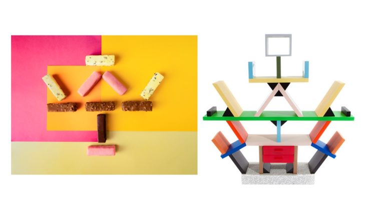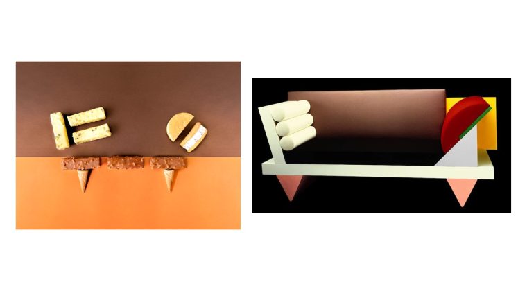 Ridisegnate in questo modo particolare sono la libreria-totem Carlton immaginata e creata nel 1981 da Ettore Sottsass o la Big Sur Sofa, disegnata da Peter Shire nel 1986 ed entrambe del Memphis Group, uno dei più importanti gruppi di design al mondo fondato da Sottsass nel 1980. Barrette ricoperte di cioccolato bianco e pistacchi di Bronte ripiene di un cuore di fiordilatte e salsa al miele millefiori di montagna dell’apicoltore marchigiano Giorgio Poeta si trasformano nello schienale della Big Sur Sofa, mentre la barretta ripiena di fiordilatte e caramello ricoperta da una cascata di cioccolato al latte e arachidi diventa una seduta da degustare. E ancora, barrette vegan di gelato al cioccolato fondente 72% con un cuore di Amarene Brusche di Modena Igp o di gelato al fiordilatte ricoperte di cioccolato Ruby, che ricompongono e colorano idealmente i cassetti frontali del mobile-contenitore Comò D.655.1, disegnato da Gio Ponti negli anni '50 e rieditato da Molteni.