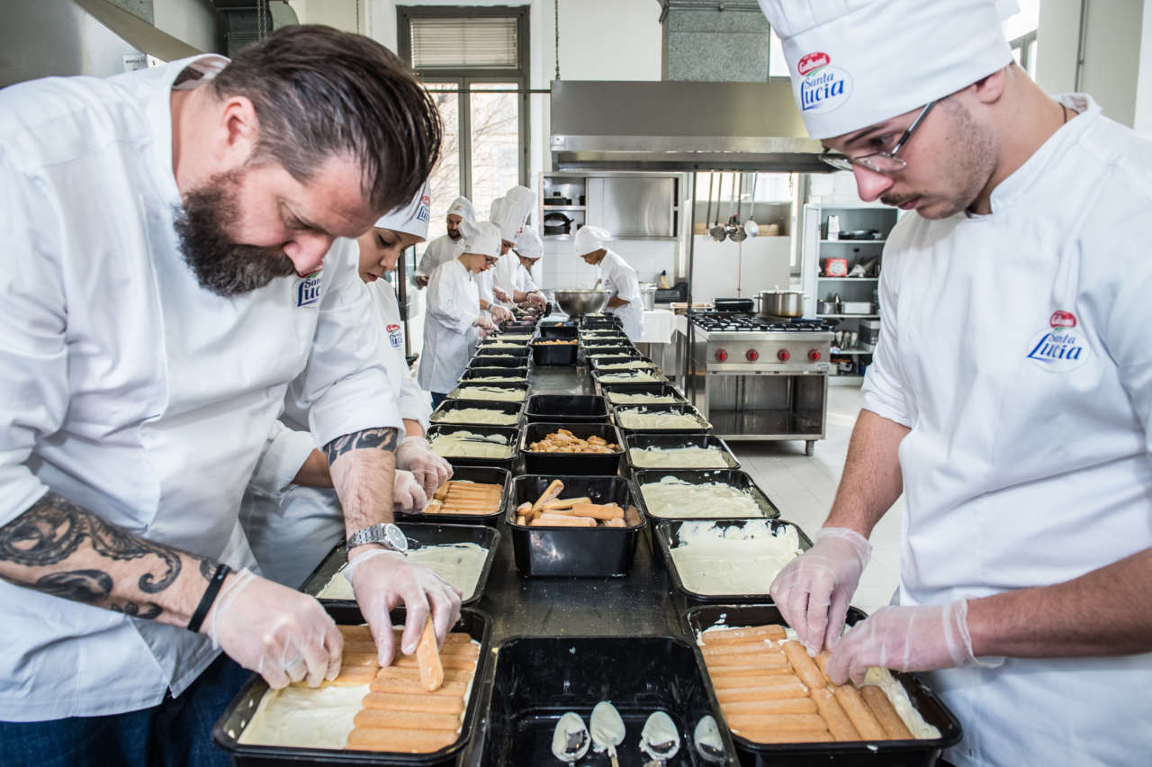 Cinquanta mila savoiardi, 500 kg di mascarpone Galbani Santa Lucia, 300 litri di caffè, 65 kg di zucchero, 60 kg di tuorlo d'uovo, 70 kg di albume d'uovo, 65 kg di cacao amaro: sono questi gli ingredienti del tiramisù più lungo del mondo. Il record, certificato da un giudice del Guinness World Record, è frutto del lavoro di 30 pasticceri della Scuola di Cucina Teatro7|Lab guidati dallo chef Stefano Callegaro.